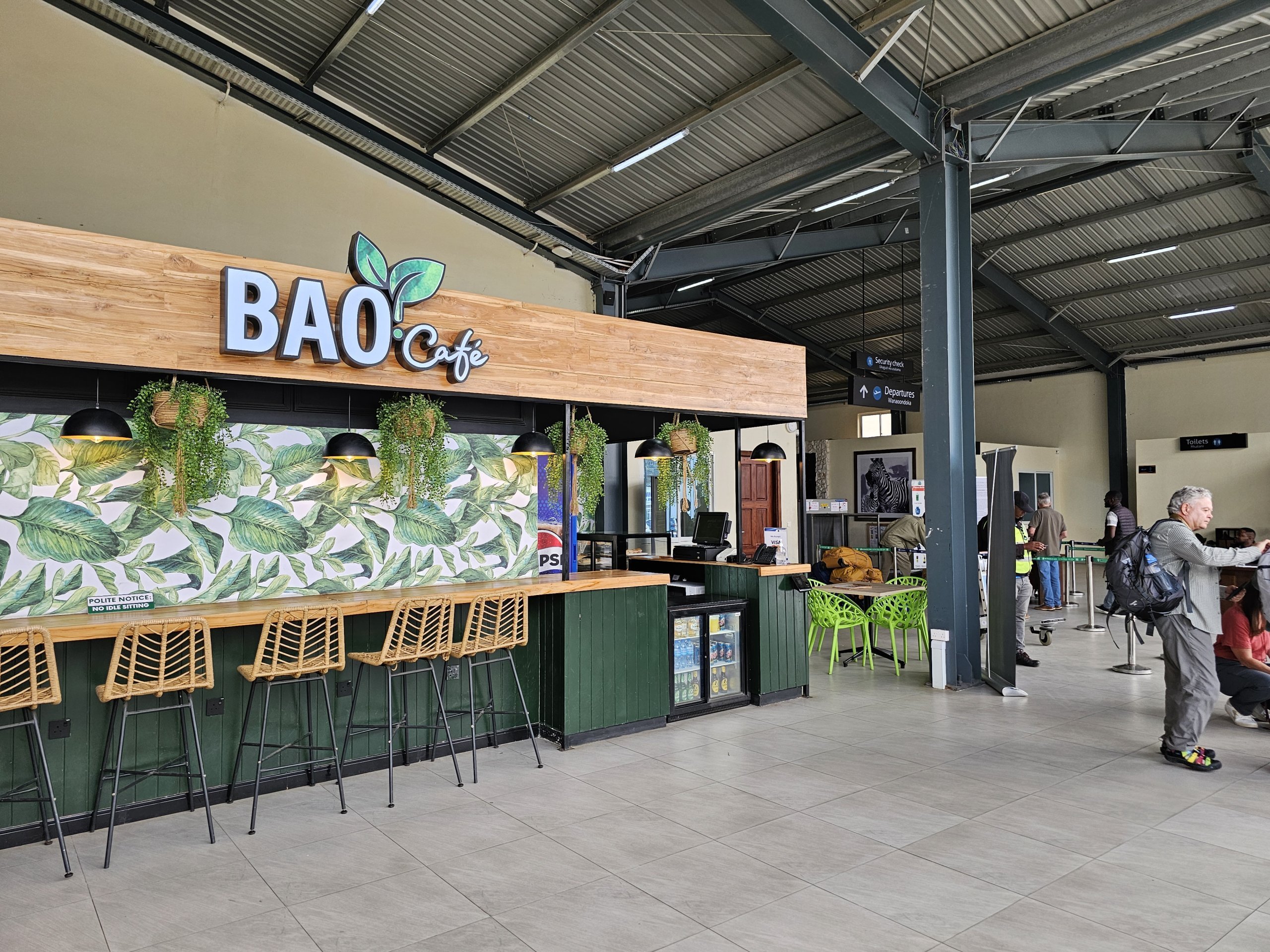 O cafenea ieftină cu gustări mici este situată într-un mic chioșc vizavi de terminalul de plecări.