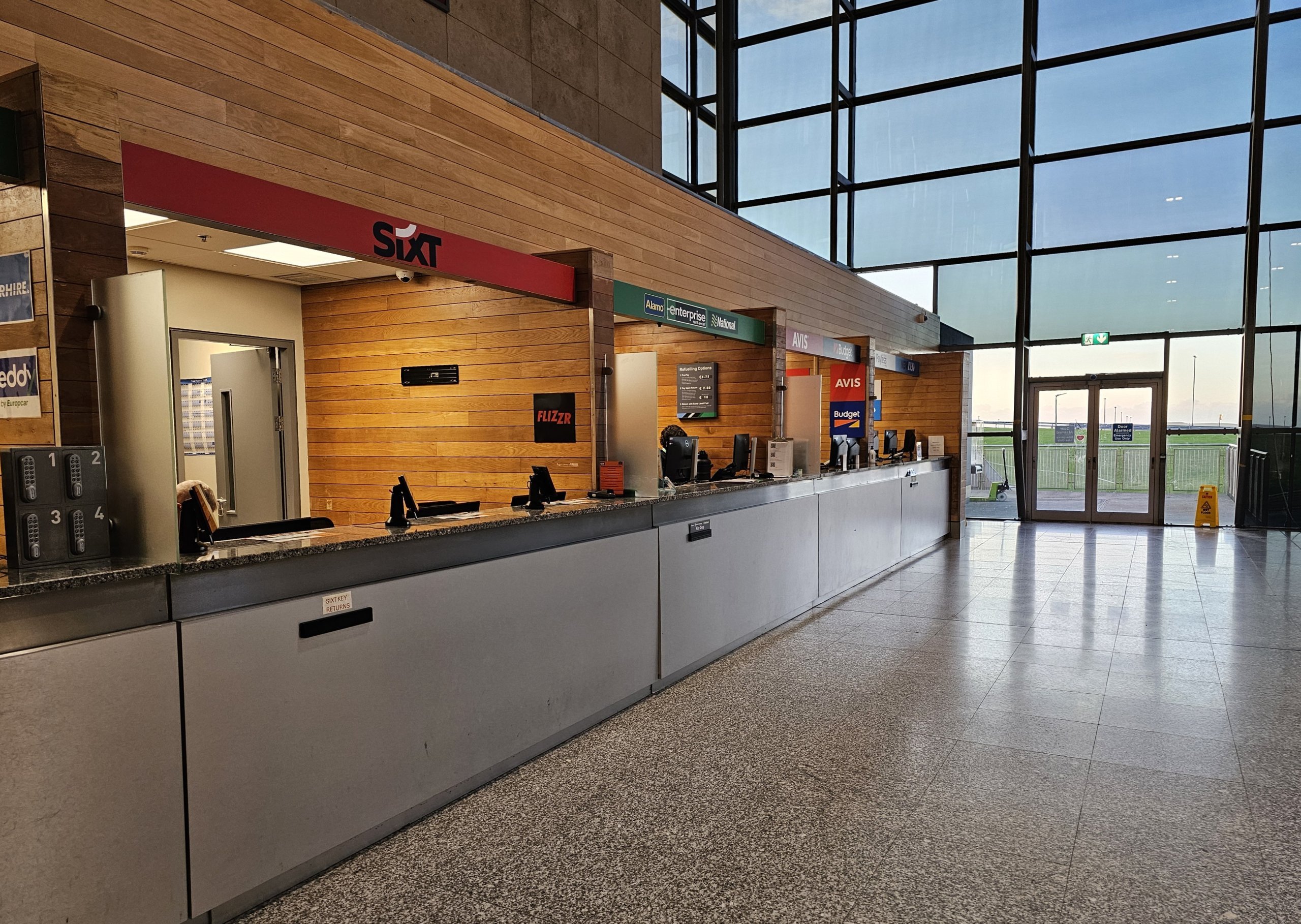 În sala de sosiri există filiale ale multor companii mari de închiriere.