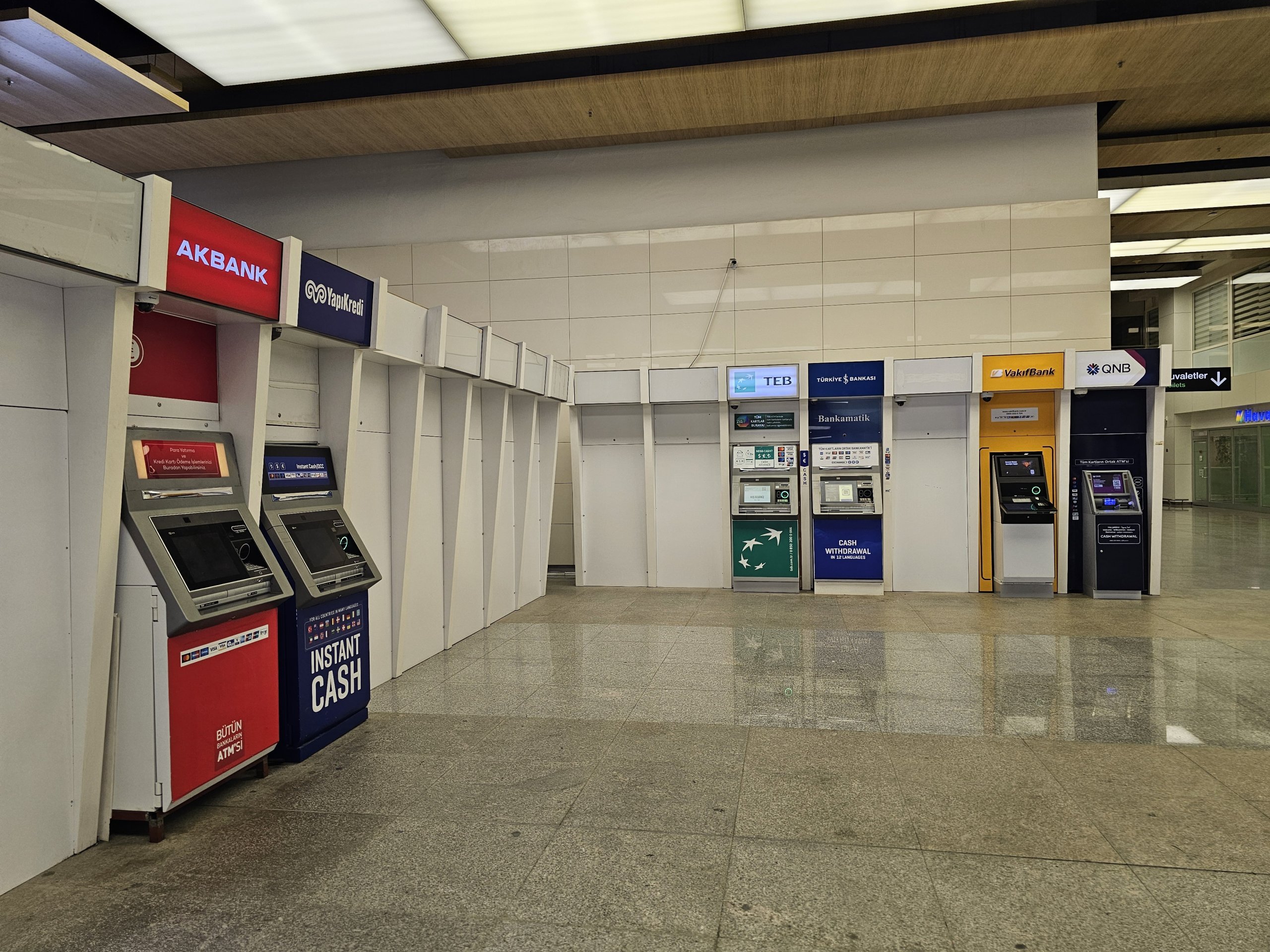 Bancomatele băncilor turcești obișnuite sunt amplasate în multe locuri în sălile de sosiri ale ambelor terminale.