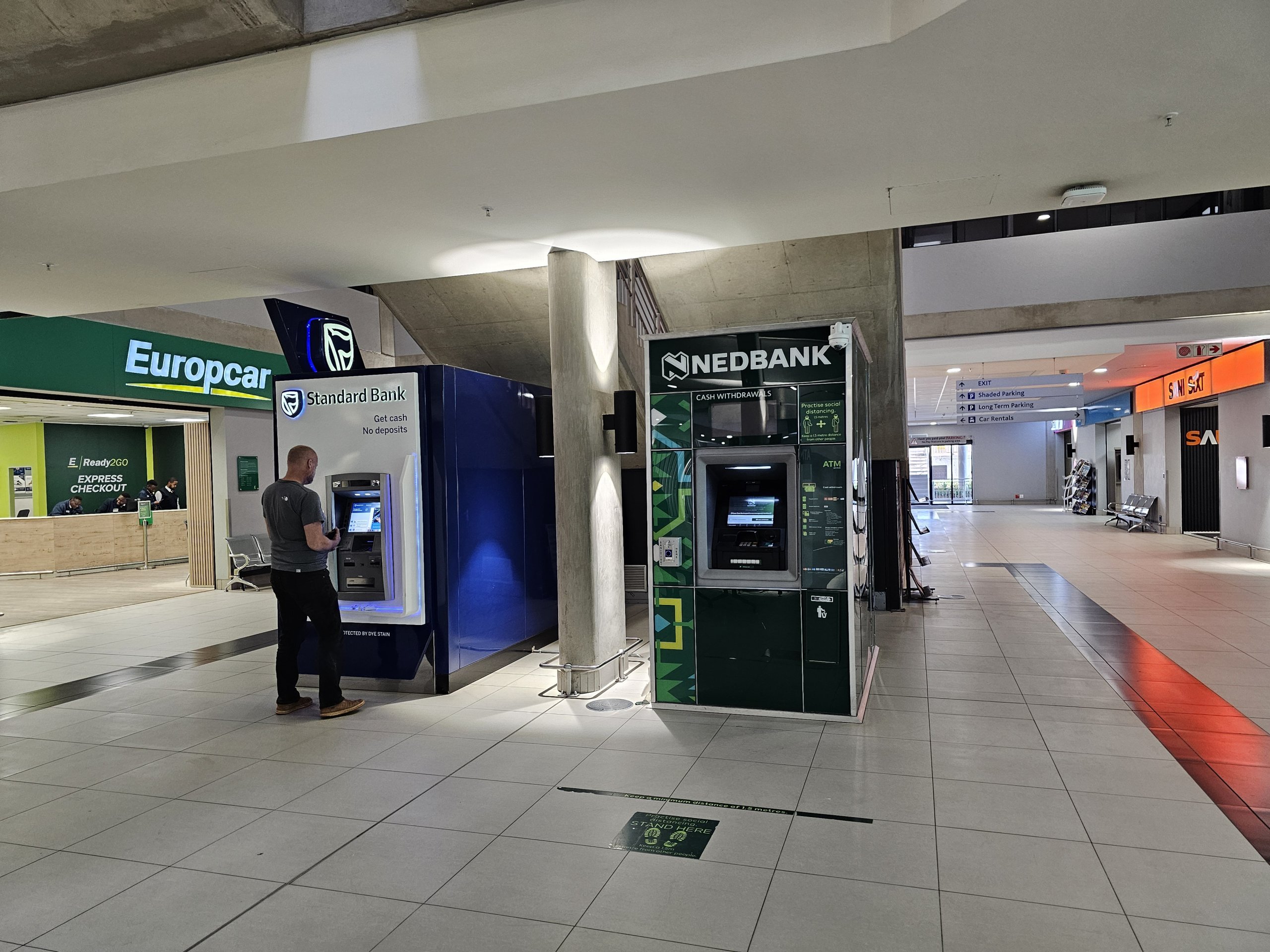 În sala de sosiri și la parterul parcării, lângă ghișeele de închirieri auto, se găsesc ATM-uri de la mai multe bănci sud-africane.