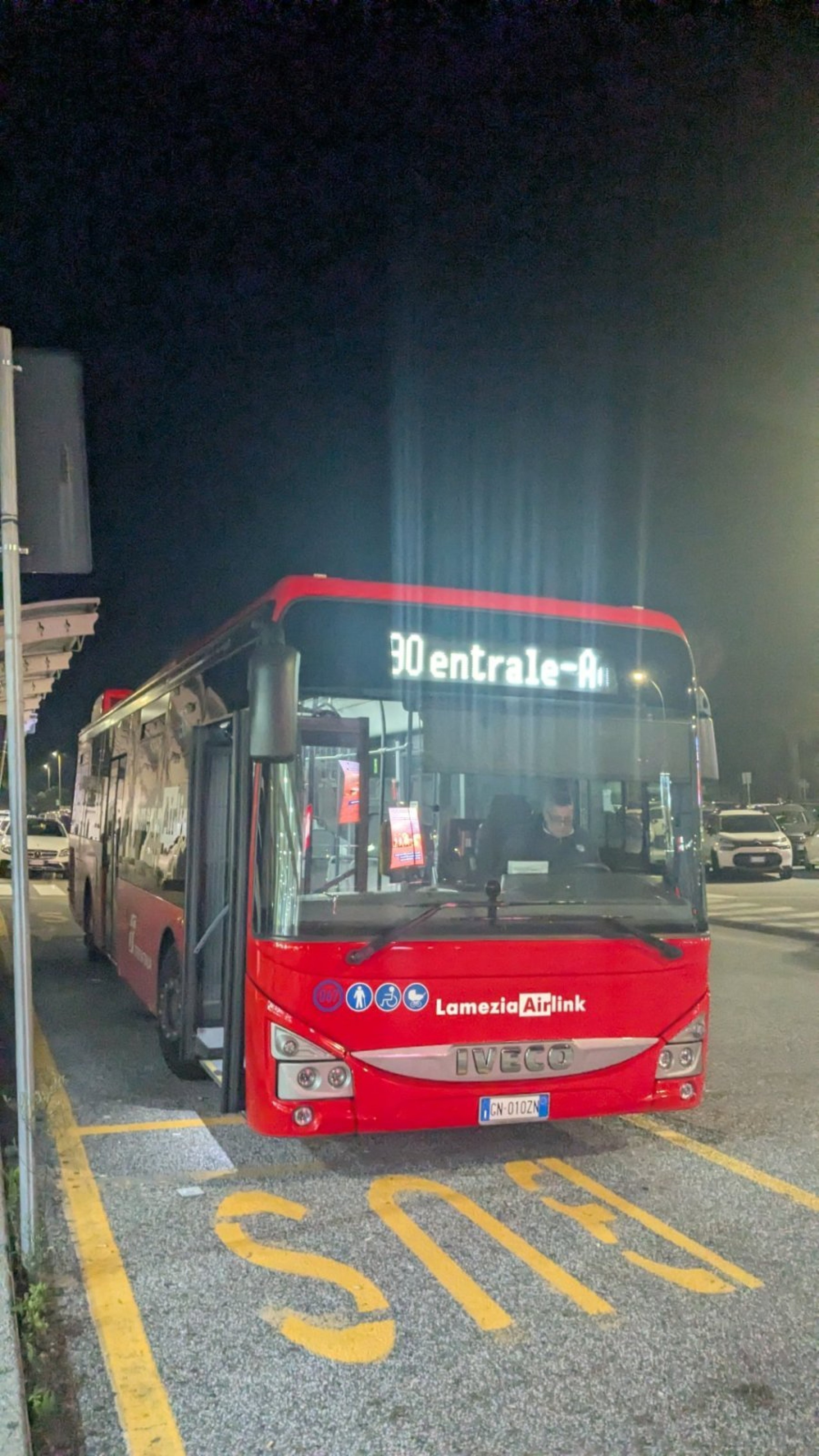 Deși ultima conexiune a liniei 90 de la aeroport la gară nu pleacă până la ora 23:15, ultimul autobuz de la gară la centrul orașului Lamezia Terme pleacă în jurul orei 22:20. După această oră, puteți lua doar un taxi către centru.