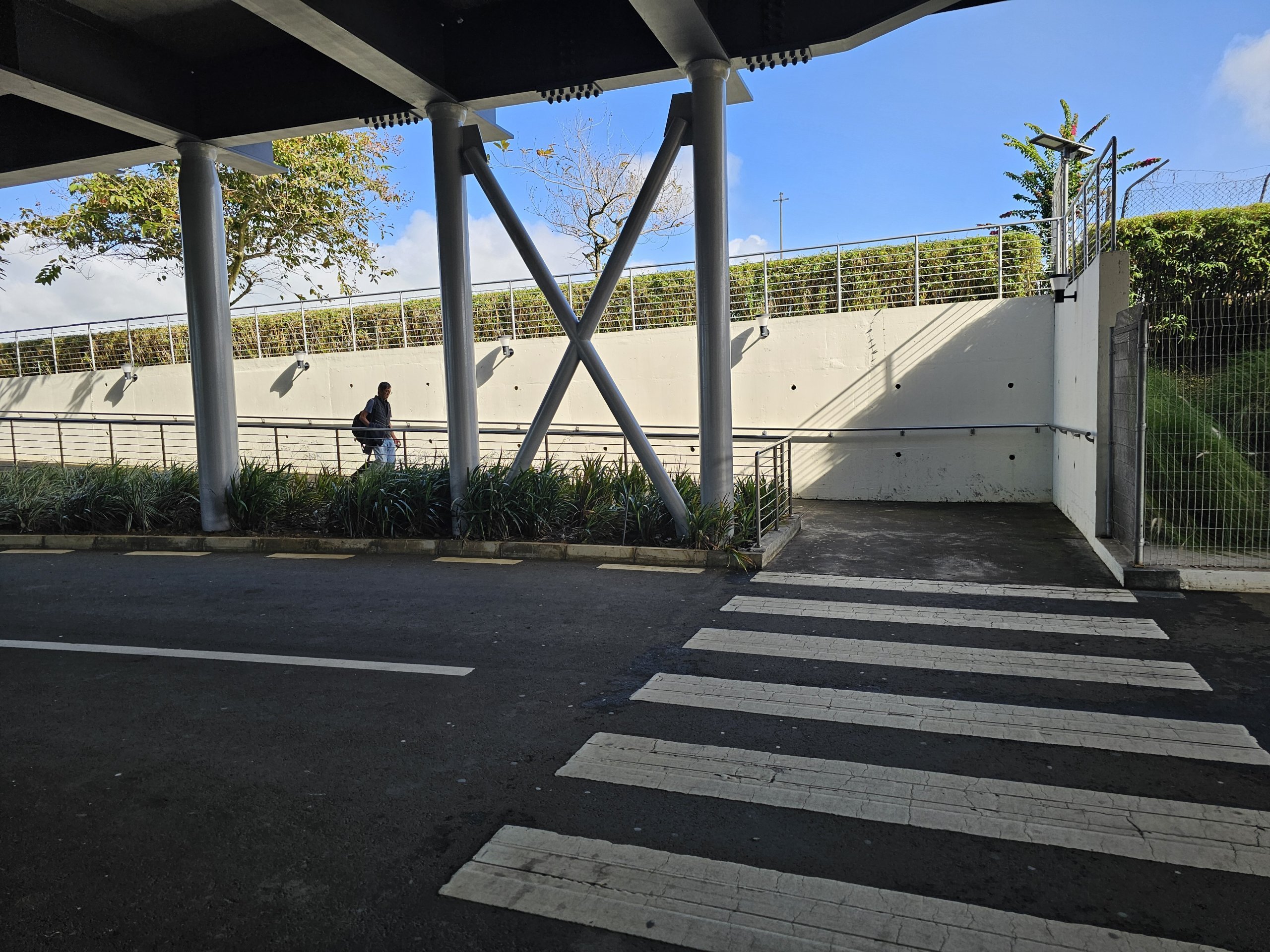 Stația de autobuz de la aeroport nu este marcată în niciun fel. Ieșiți din sala de sosiri pe partea stângă, treceți prin parcarea de autobuze a agenției turistice și urmați trotuarul în diagonală în sus pe dreapta.