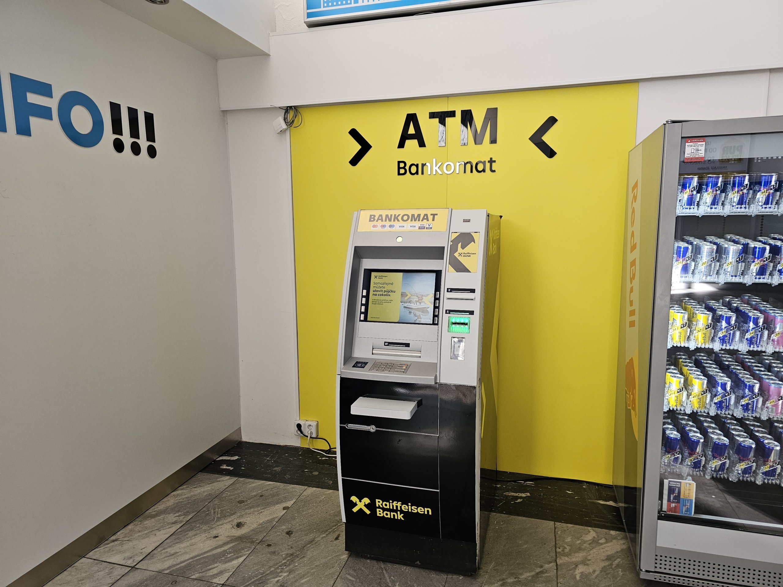 Puteți utiliza bancomatul Raiffeisenbank din zona publică a sălii de sosiri.