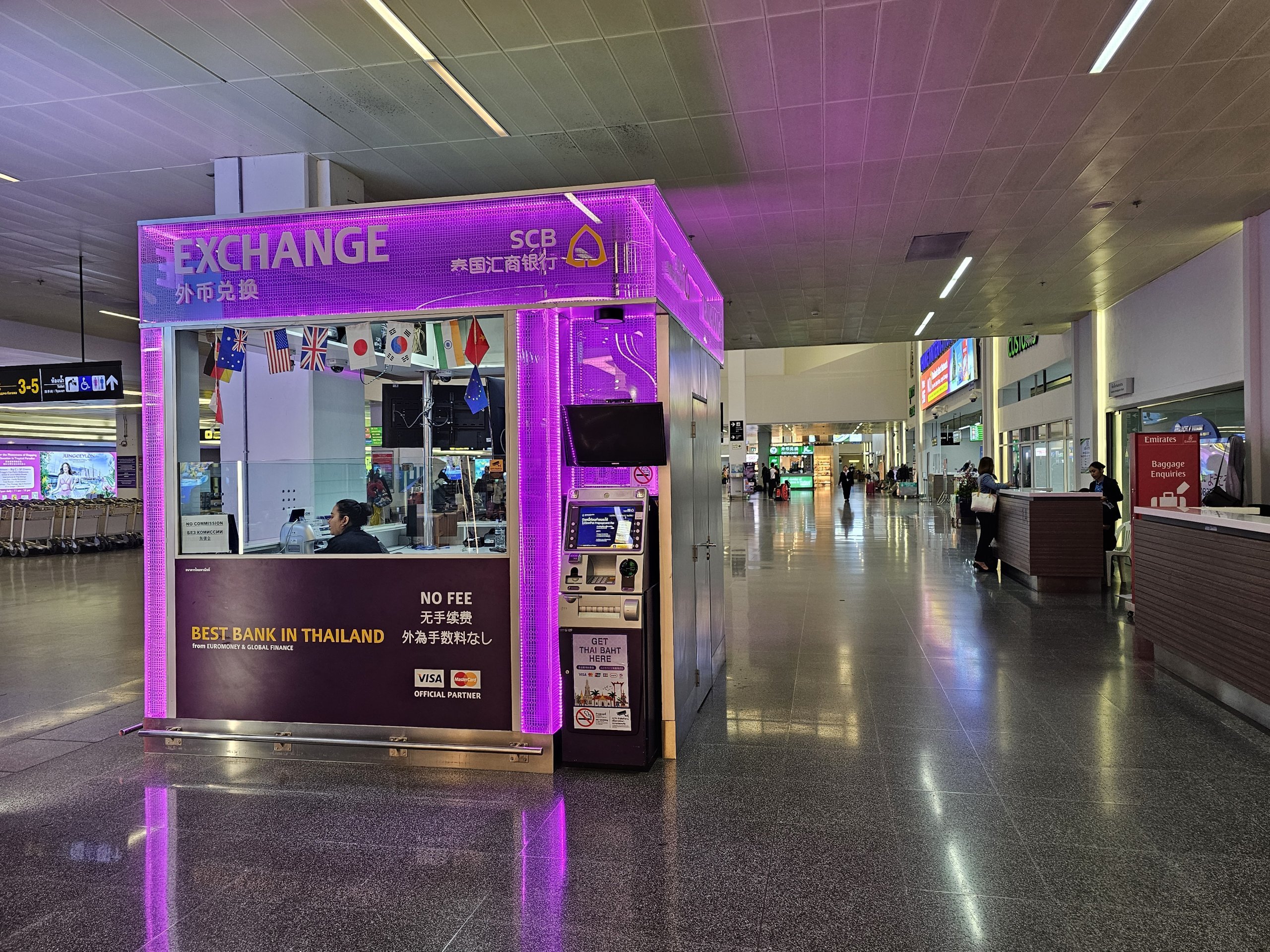 Dacă preferați o retragere mai rapidă de la bancomat, în aeroport există multe bancomate ale băncilor thailandeze locale. Comisionul pentru retragerile cu carduri străine este întotdeauna de 220 thb. Prin urmare, bancomatele merită utilizate doar pentru retrageri mai mari.