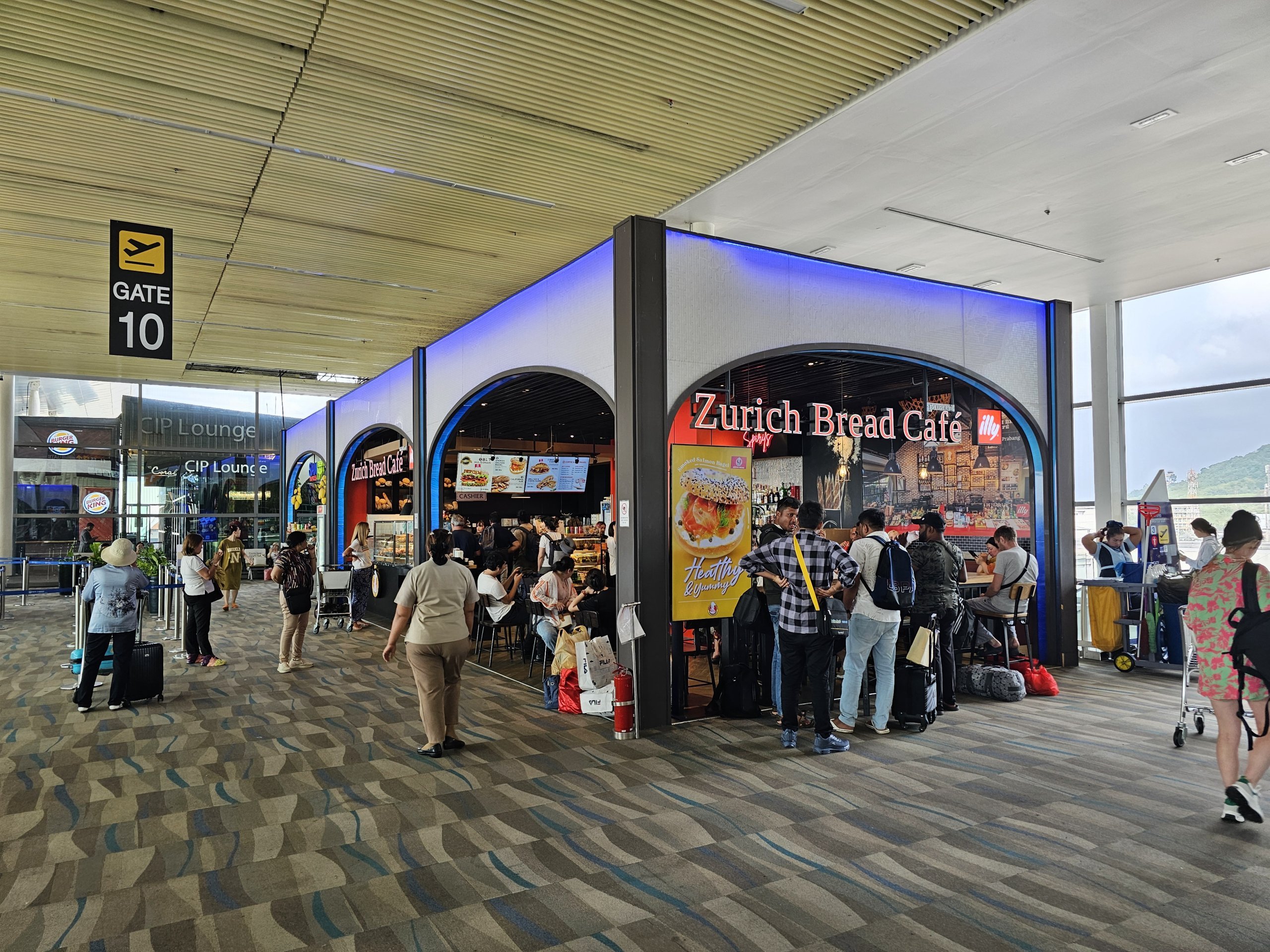 După controlul de securitate sunt disponibile restaurante locale, cantine și fast-food internațional Burger King (24/7).