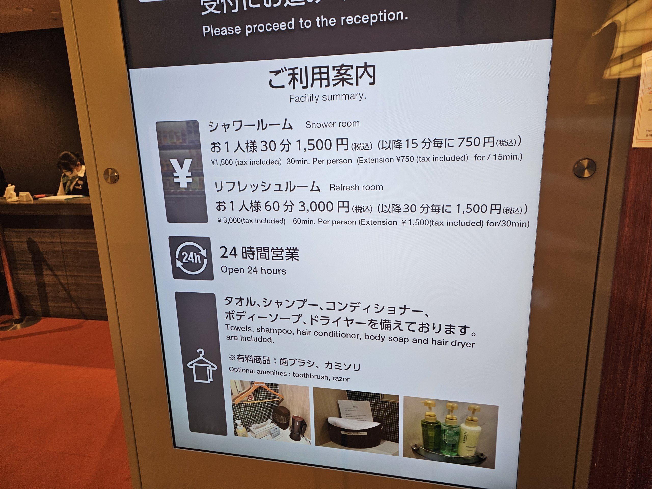 - Shower Room - zonă publică, Arrivări 1F, deschis 5:00-10:00/16:00-22:00, taxă pentru duș de 30 de minute 1 500 jpy