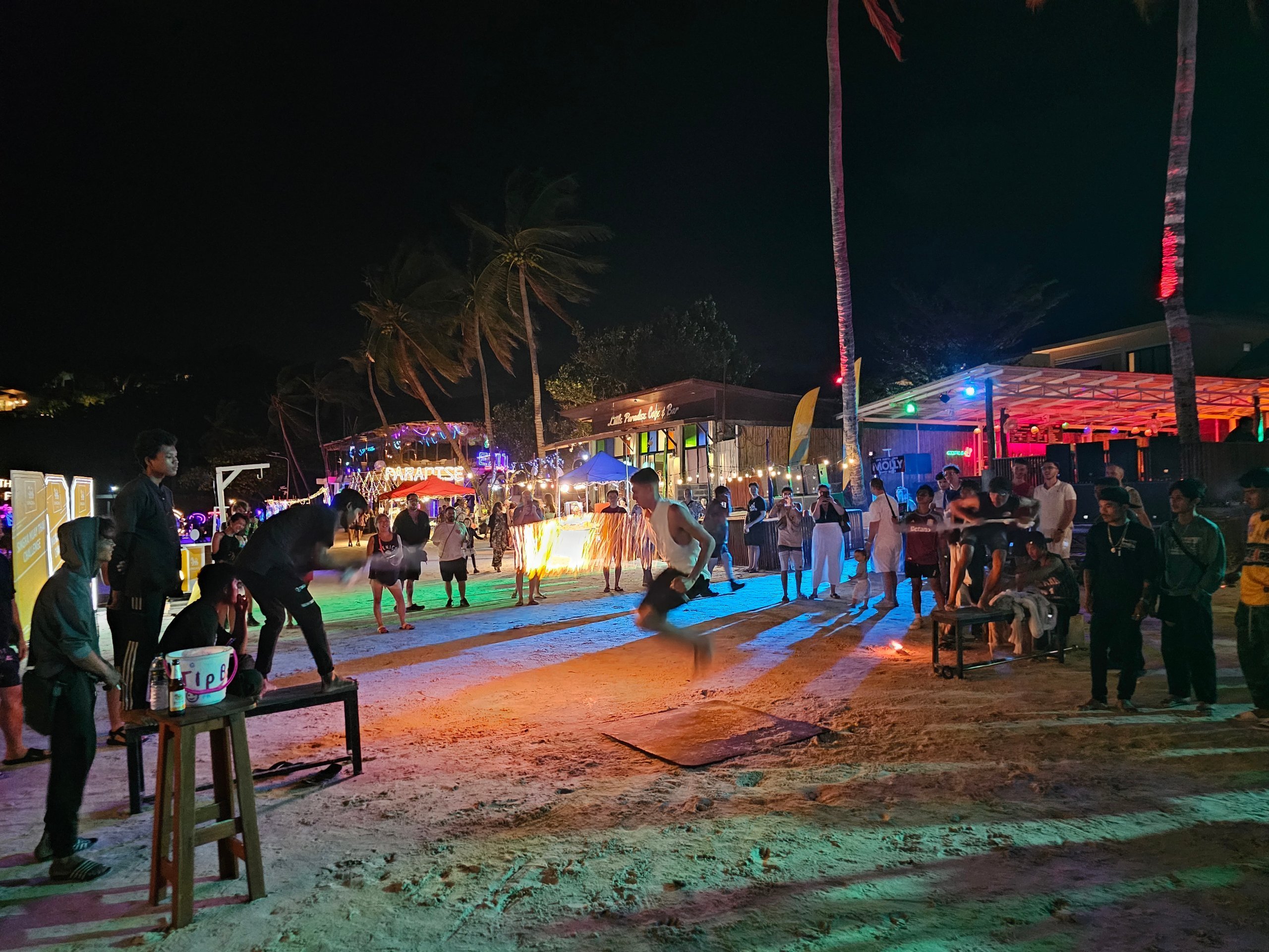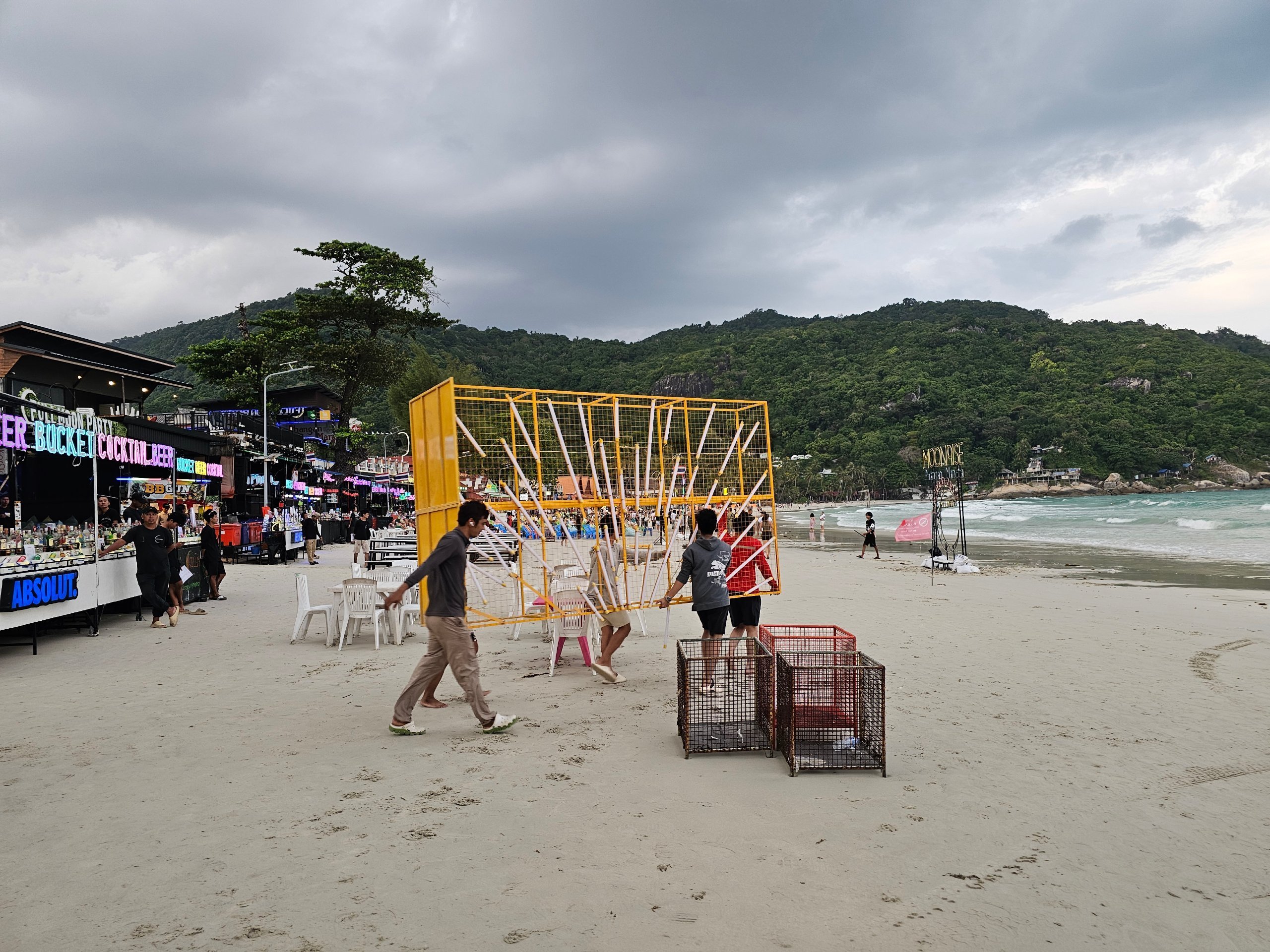 Prima noastră vizită pe plaja Haad Rin a fost după-amiaza, când pregătirile erau încă în desfășurare.