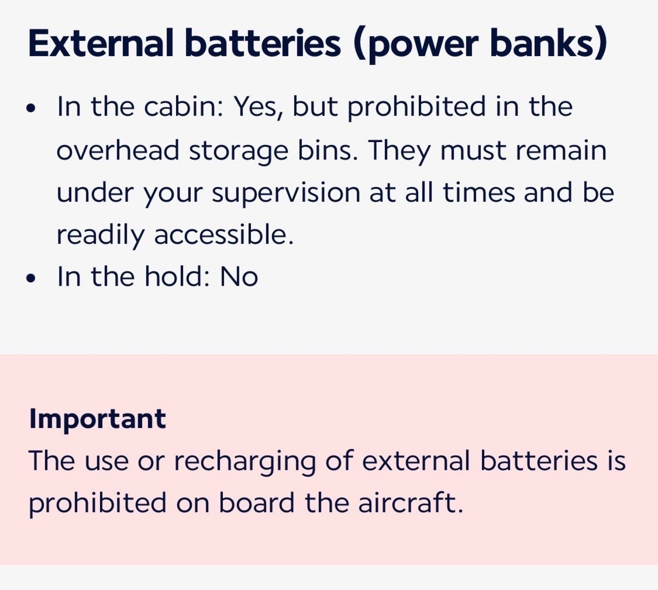 La unele companii aeriene (consultați lista de la sfârșitul acestui articol) trebuie să păstrați powerbank-ul în afara bagajului de mână - de exemplu, în buzunarul scaunului din fața dumneavoastră, nu în coșul de deasupra capului.
