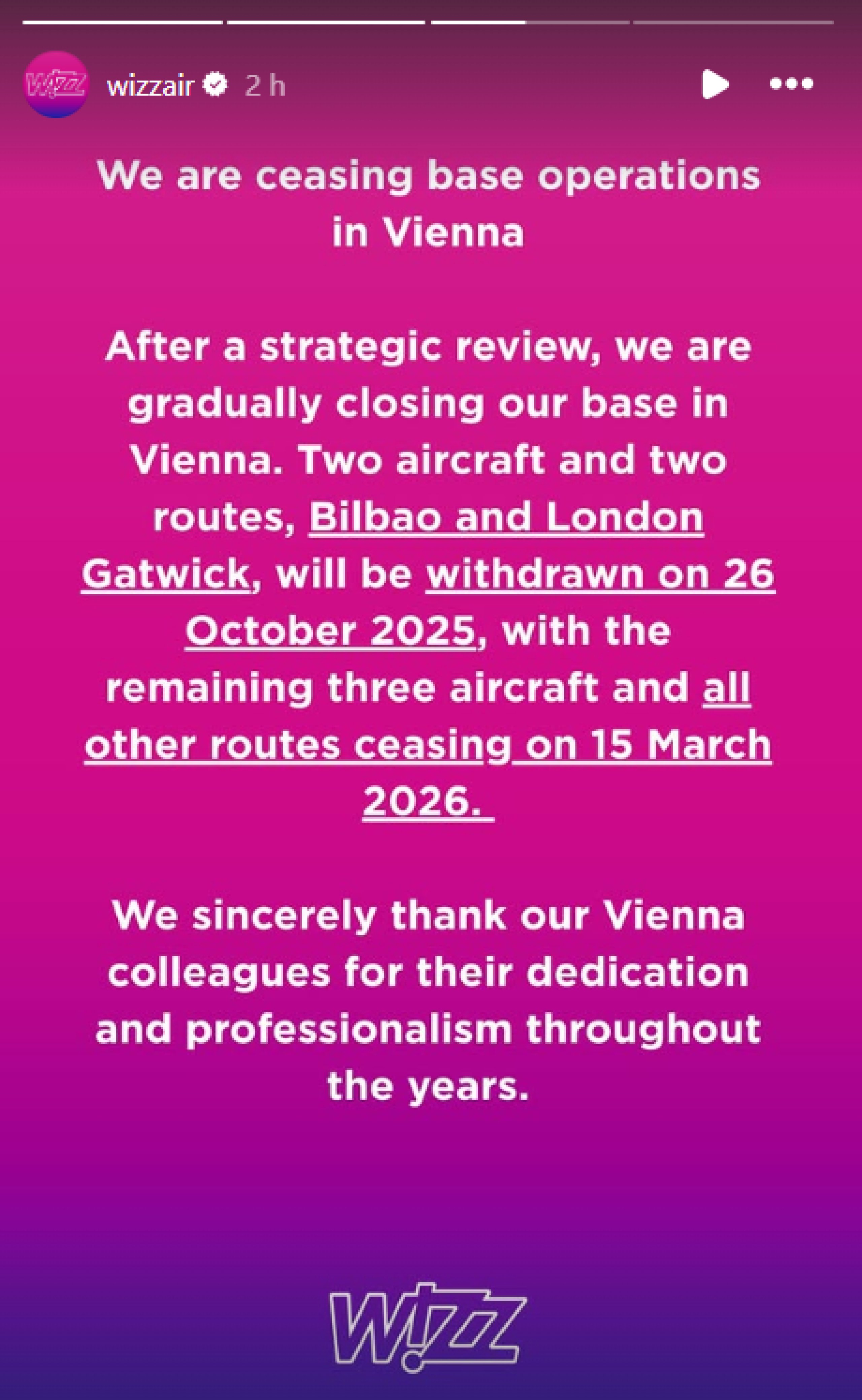 Wizz Air a anunțat astăzi pe profilul său de Instagram că își va închide baza din Viena, unde are în prezent 5 aeronave.