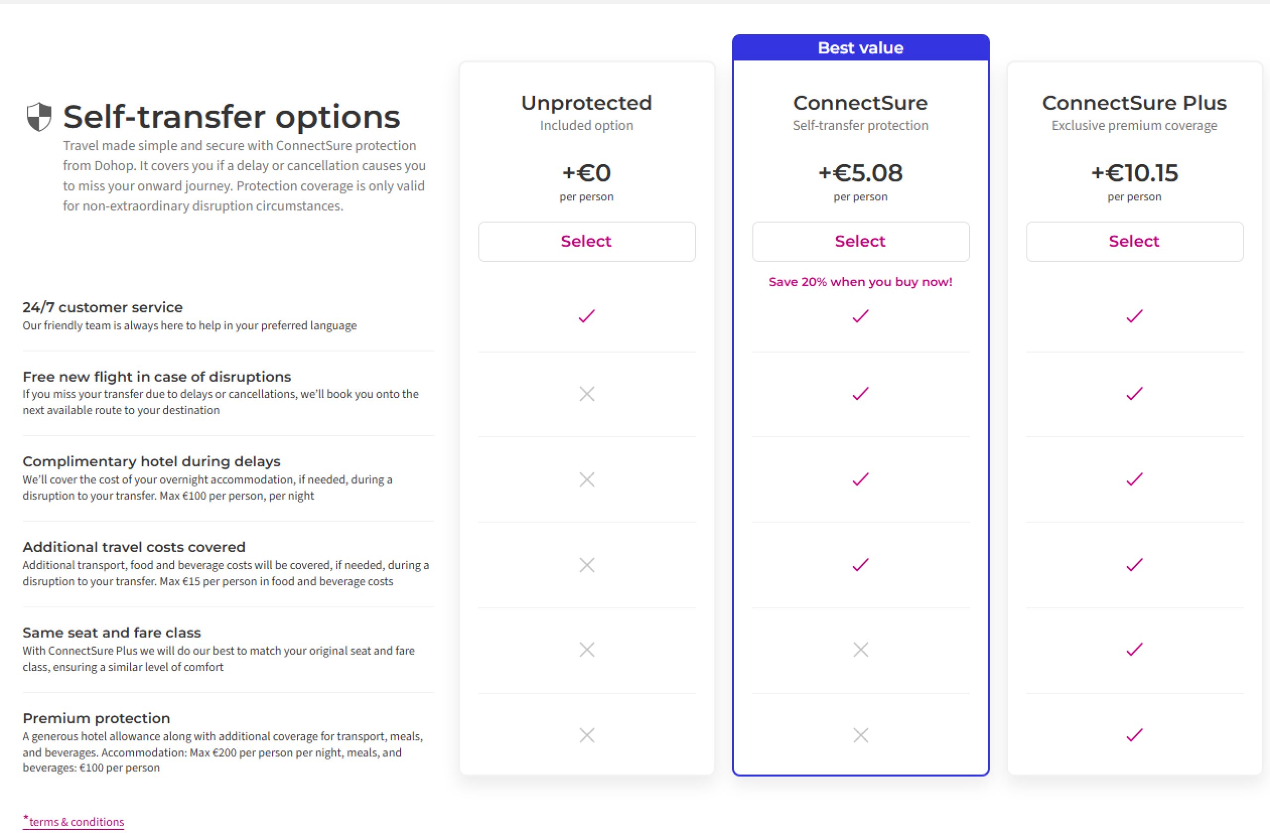 Dacă doriți să aveți un zbor de legătură garantat, trebuie să achiziționați ConnectSure împreună cu biletele dumneavoastră, care este selectat în timpul procesului de rezervare a zborului.