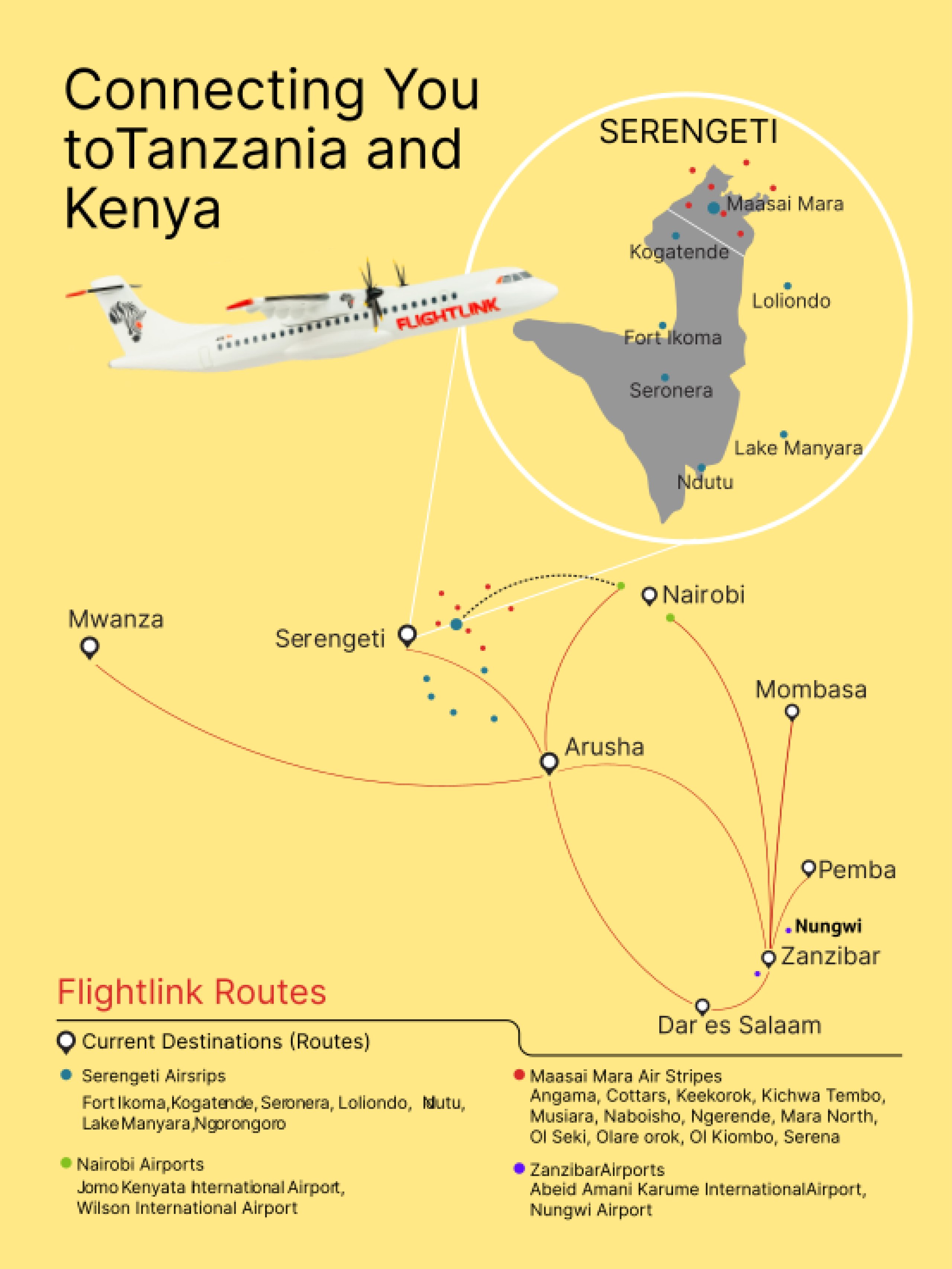Flighlink se concentrează pe conectarea principalelor destinații turistice din Tanzania cu cel mai mare oraș , Dar es Salaam.