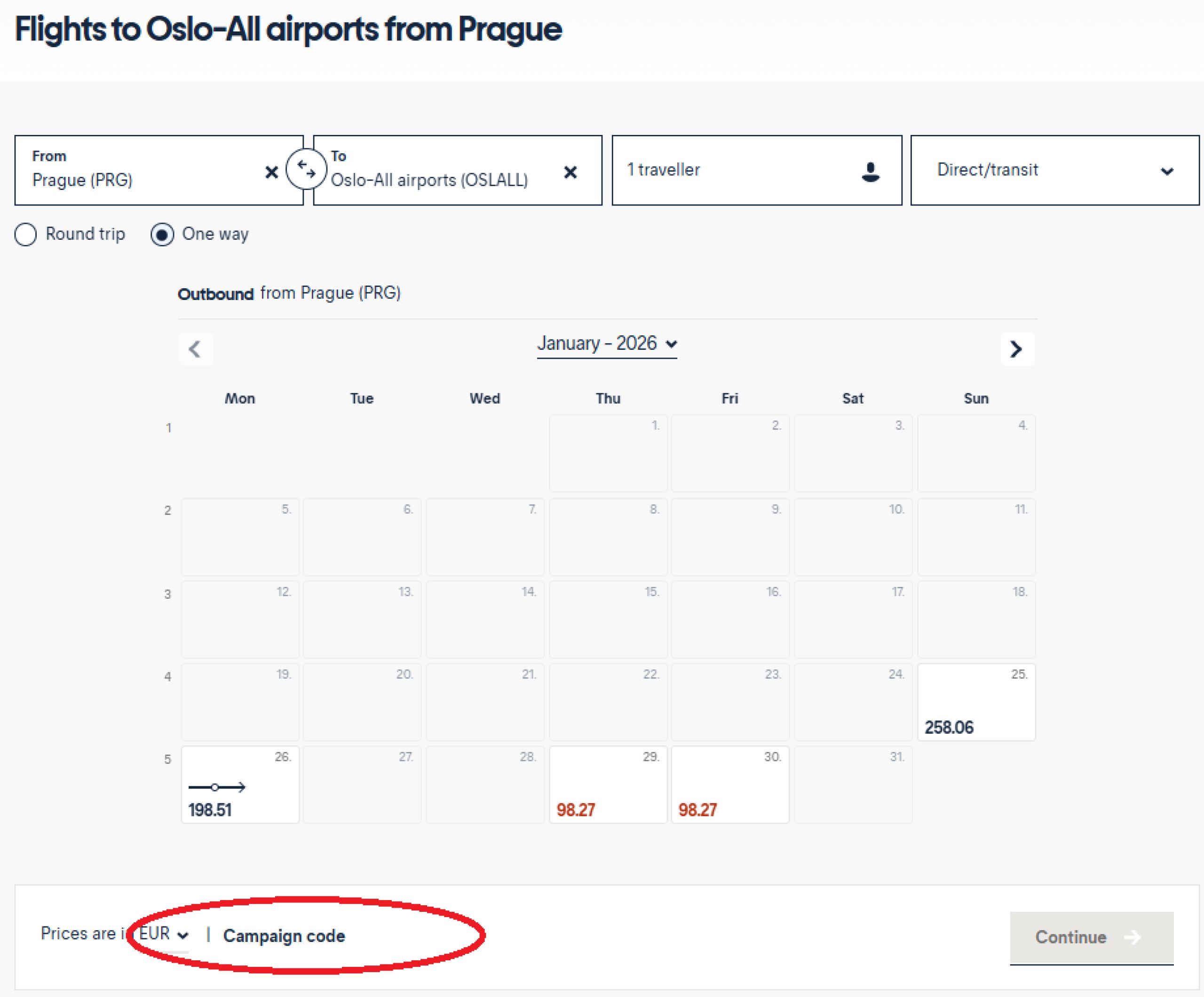 - 💡Sfat: Dacă ai între 12-25 de ani, folosește codul promoțional UNDER26 pentru zboruri în Scandinavia. Veți obține tarife speciale pentru un singur drum, adesea cu 20% reducere. Codul promoțional se introduce în caseta "Cod campanie" atunci când vedeți calendarul zborurilor ieftine, vezi imaginile de mai jos.