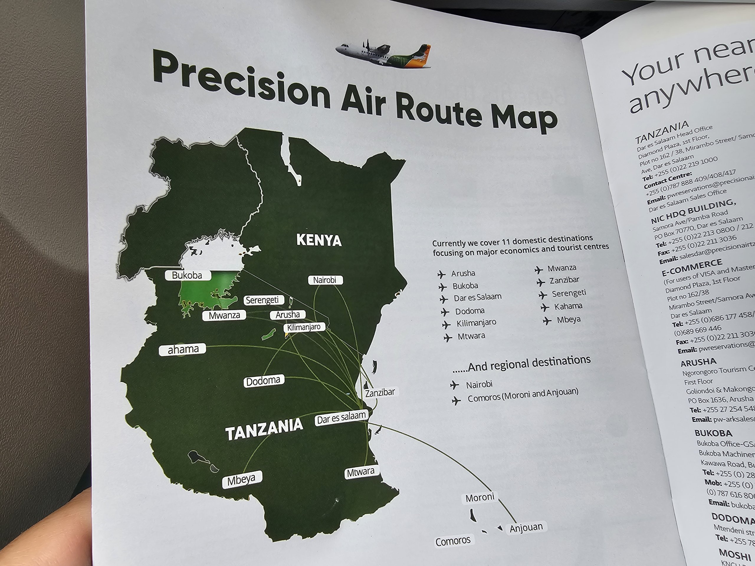 Precision Air este o companie aeriană de rețea care oferă zboruri de legătură prin aeroporturile Dar es Salaam DAR sau, Kilimanjaro JRO sau Zanzibar ZNZ.