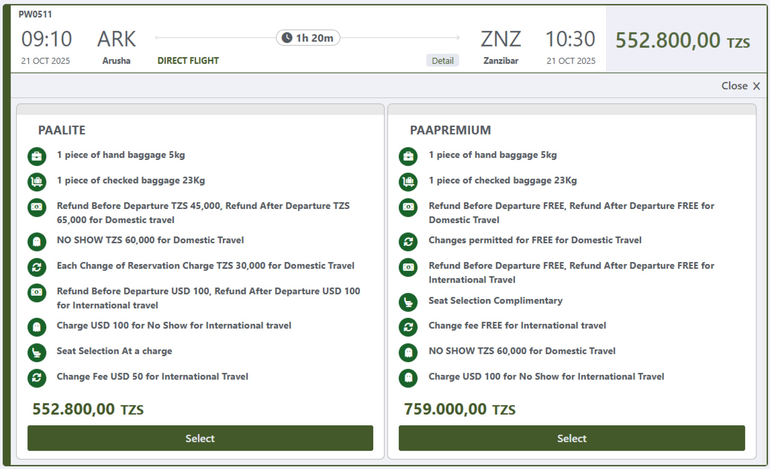 Deoarece Precision Air are concurență din partea altor companii aeriene pe multe rute din Tanzania, este util să comparați prețurile prin intermediul comparatoarelor de zboruri.