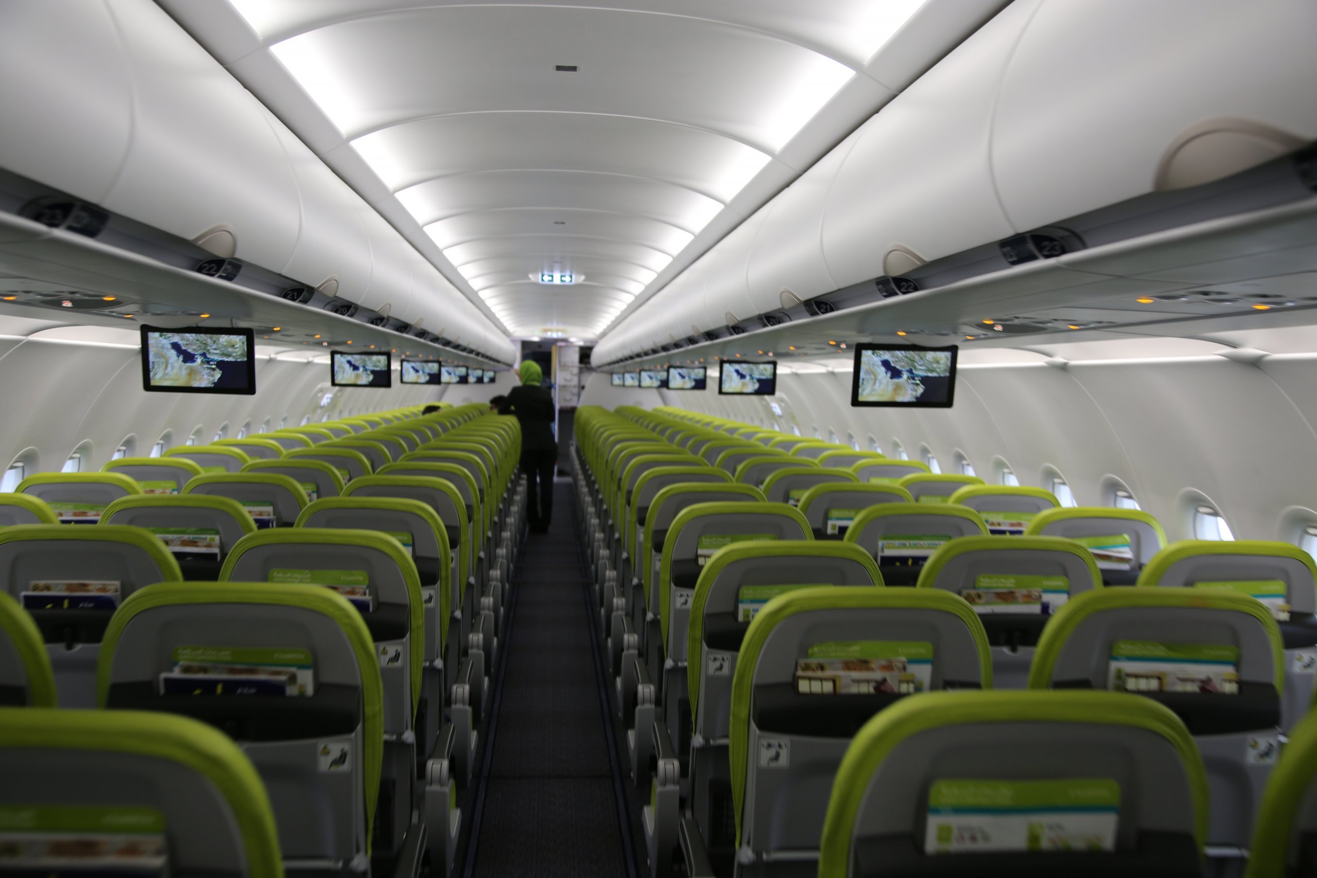 Scaunele nu conțin monitoare individuale și există doar câteva ecrane comune care proiectează itinerariul de zbor în timpul zborului.