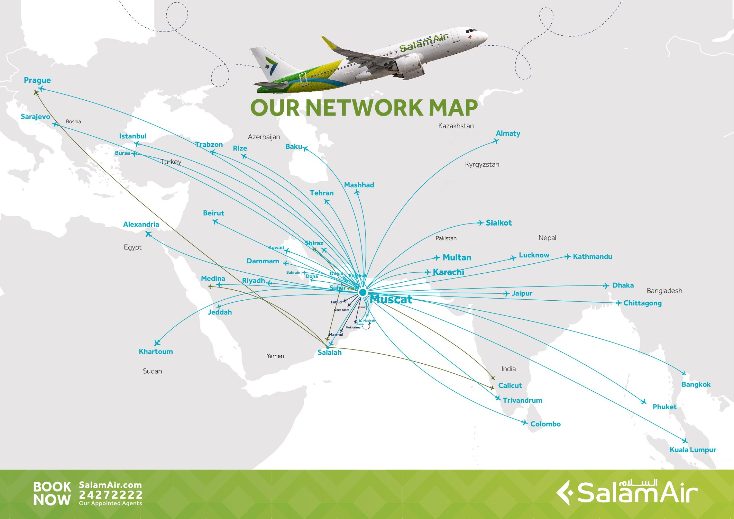 Pentru o listă clară a destinațiilor, vă rugăm să consultați harta zborurilor SalamAir la salamair.com/our-network sau imaginea de mai jos.