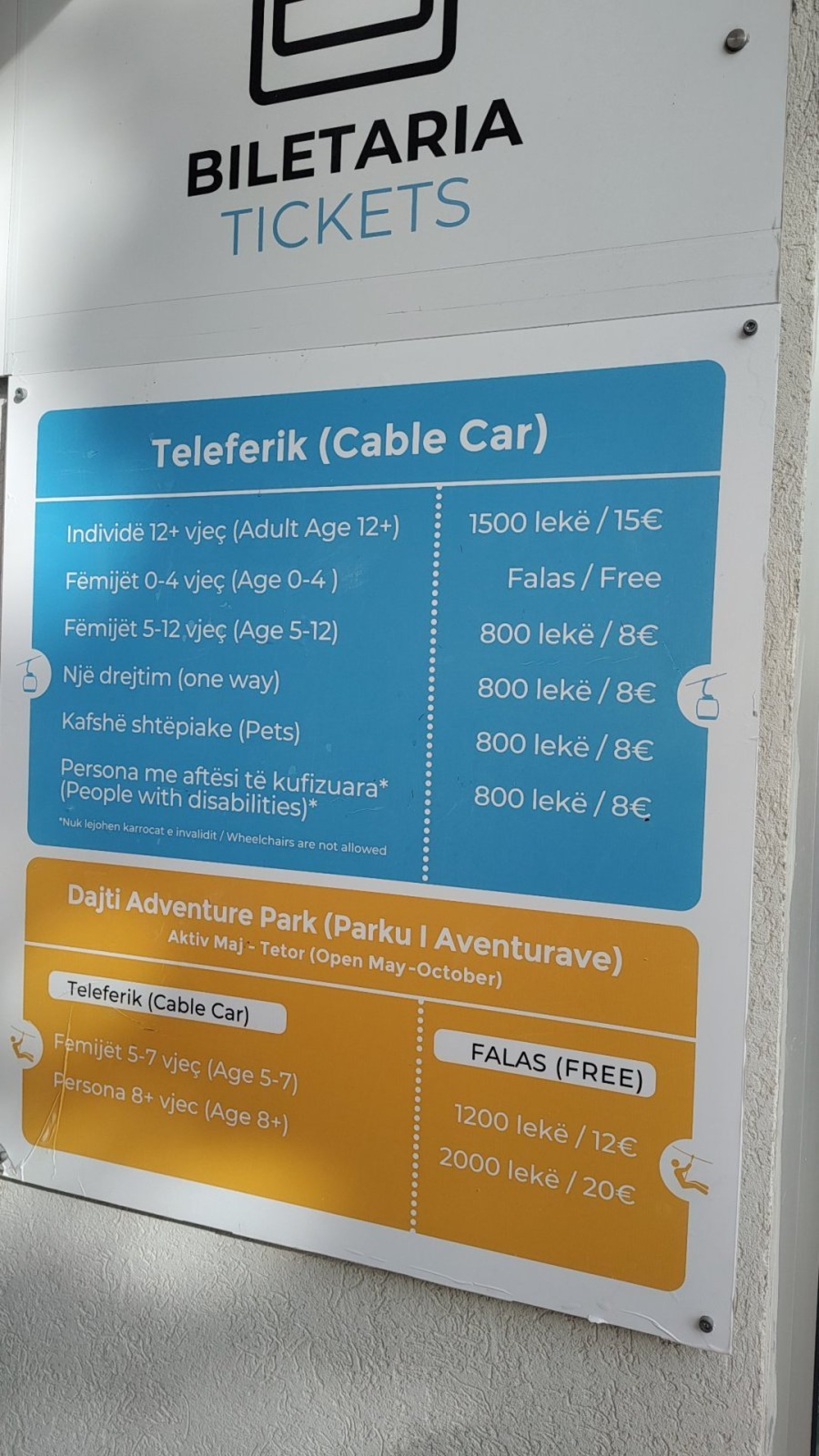 Prețul unui bilet dus-întors este de 1 500 all, iar un bilet dus costă 900 all. Puteți plăti și cu cardul de credit.