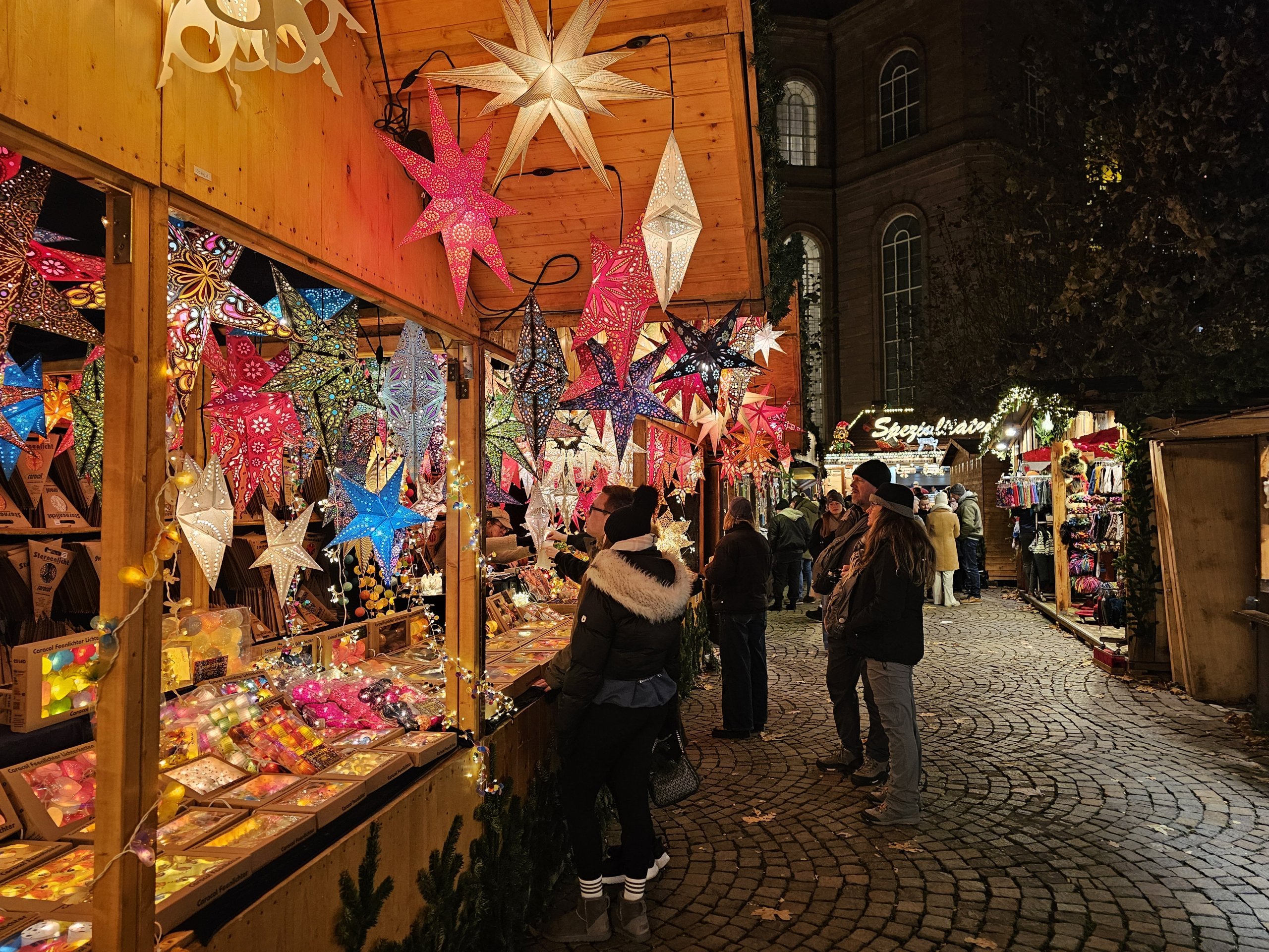 La doar câțiva pași de Römerberg, în fața Paulskirche, piața de Crăciun continuă cu mai multe tarabe și o atmosferă complet diferită.