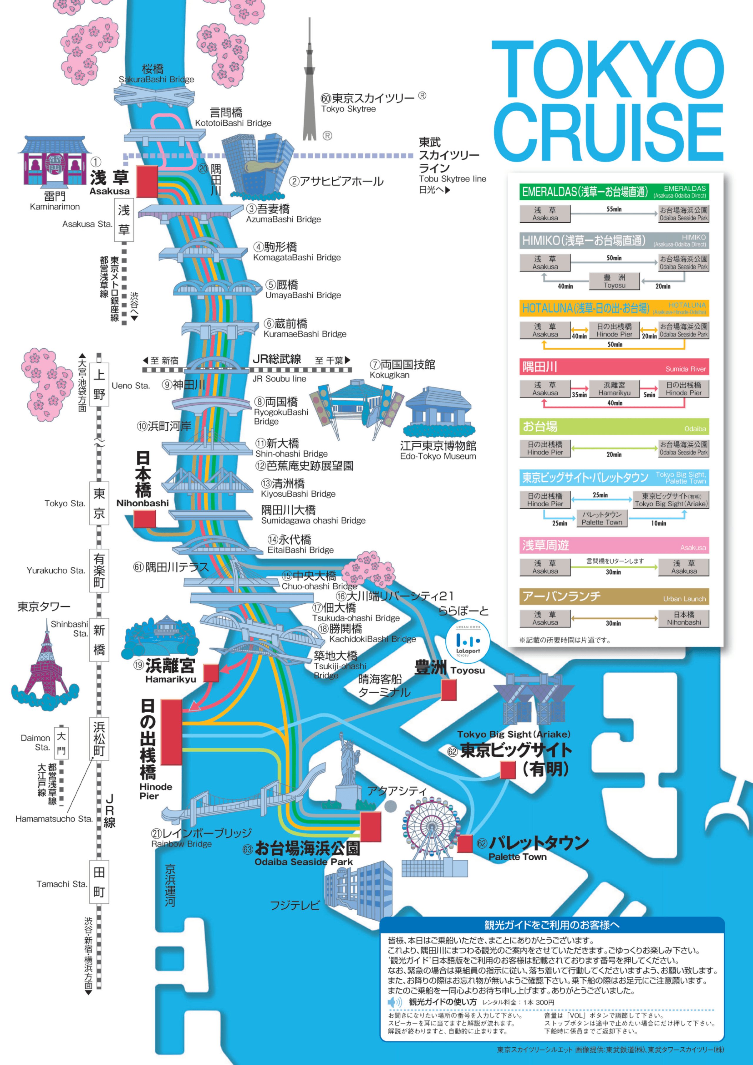 Feriboturile navighează de aproximativ 8-9 ori pe zi și întreaga călătorie de la Asakusa la Statuia Libertății din Odaiba durează aproximativ 45 de minute.