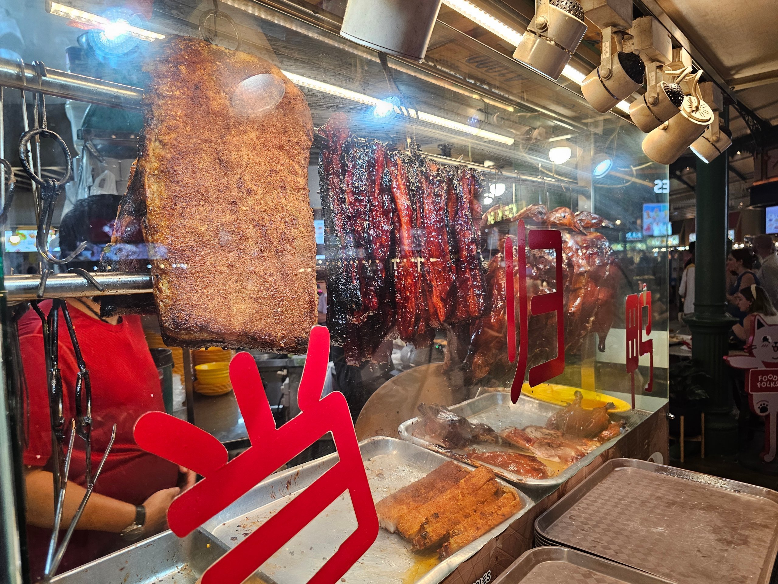 Atmosfera este complet diferită de cea din interiorul pieței - mirosul de carne la grătar, fumul de la grătare și viața de noapte agitată creează una dintre cele mai emblematice experiențe de street-food din Singapore.