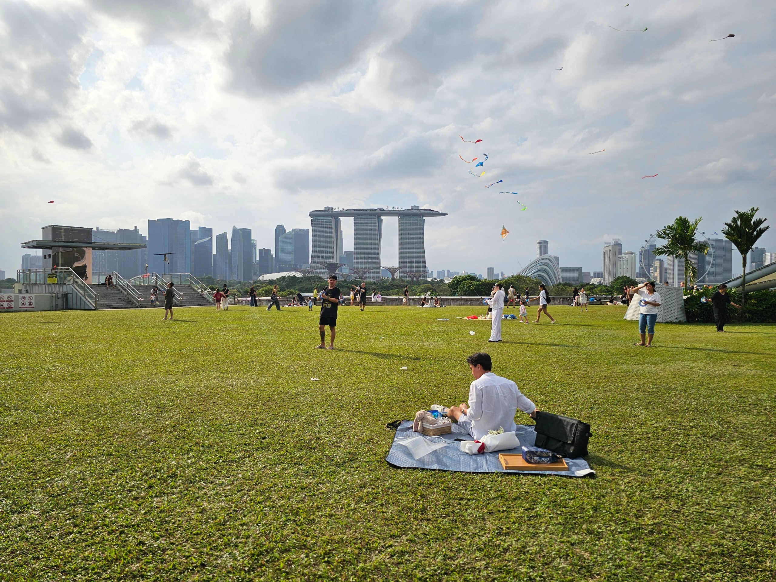 Doar o zonă mare cu iarbă pe acoperișul barajului, de unde se poate vedea întreaga linie a orizontului Marina Bay - inclusiv Marina Bay Sands și Gardens by the Bay.