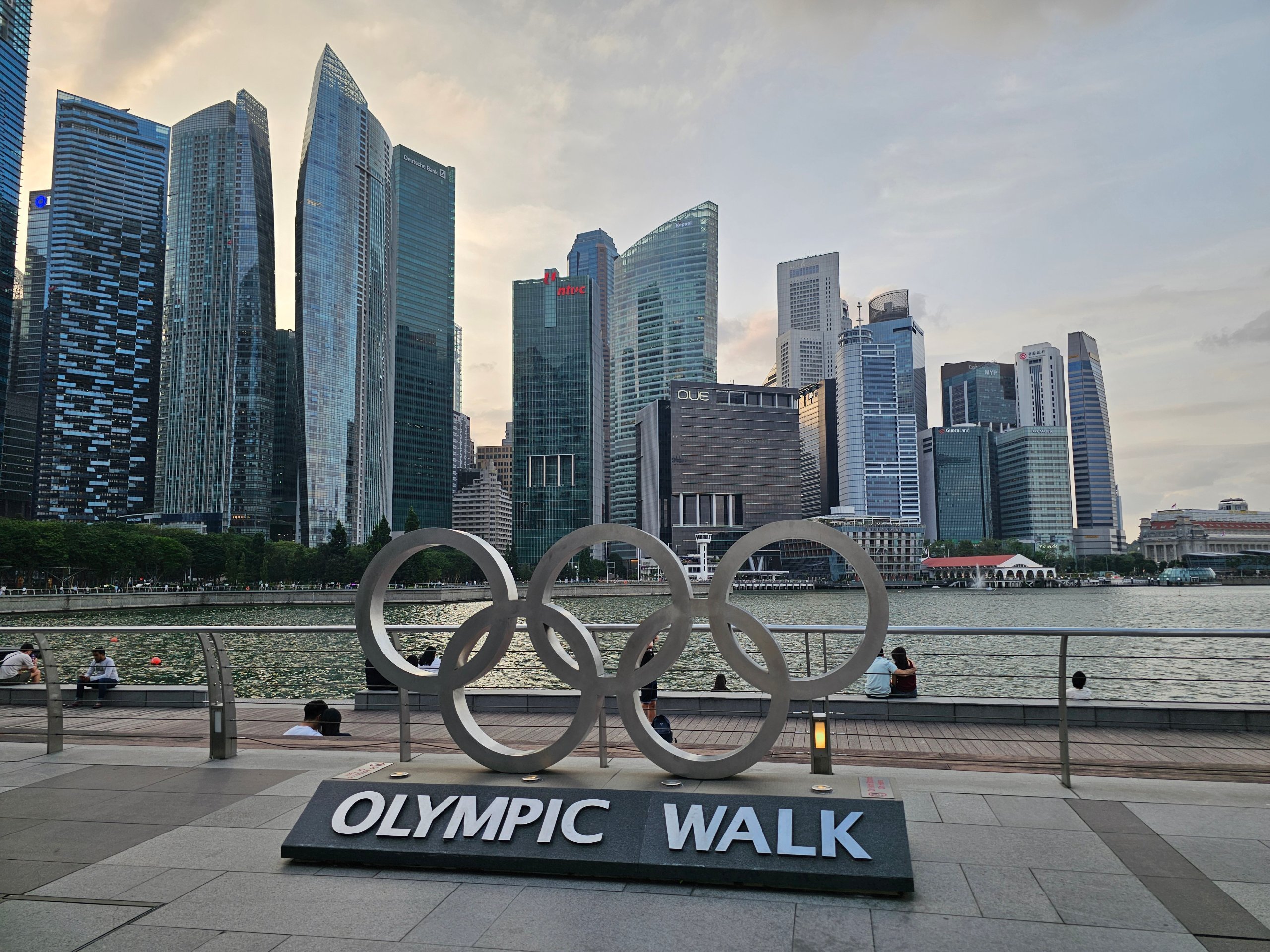 Promenada pietonală largă cu palmieri, o parte din care se numește Olympic Walk, este unul dintre locurile mele preferate din Singapore.