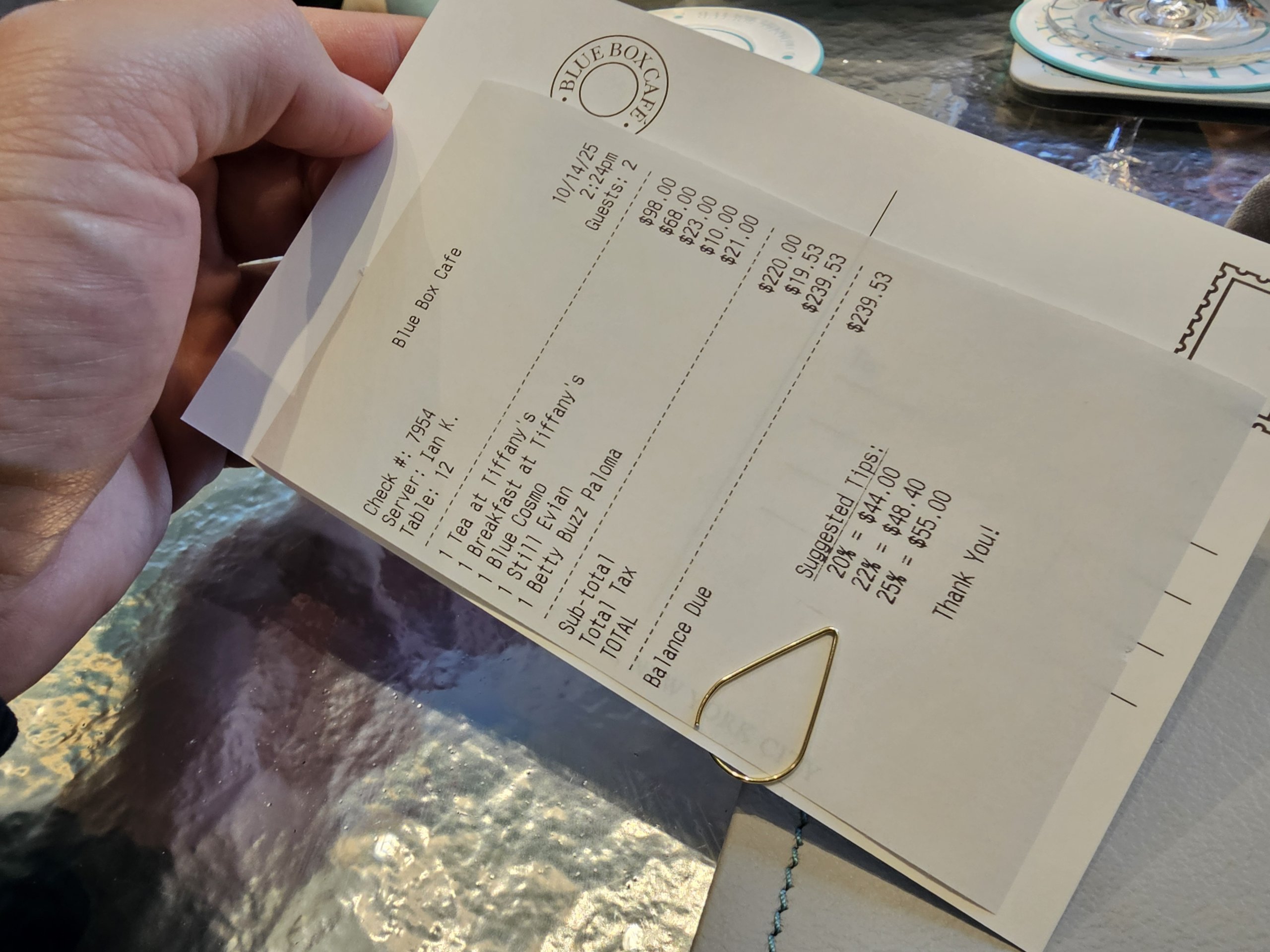 Am comandat Breakfast at Tiffany's și Tea at Tiffany's și două cocktailuri pentru a merge cu ea.