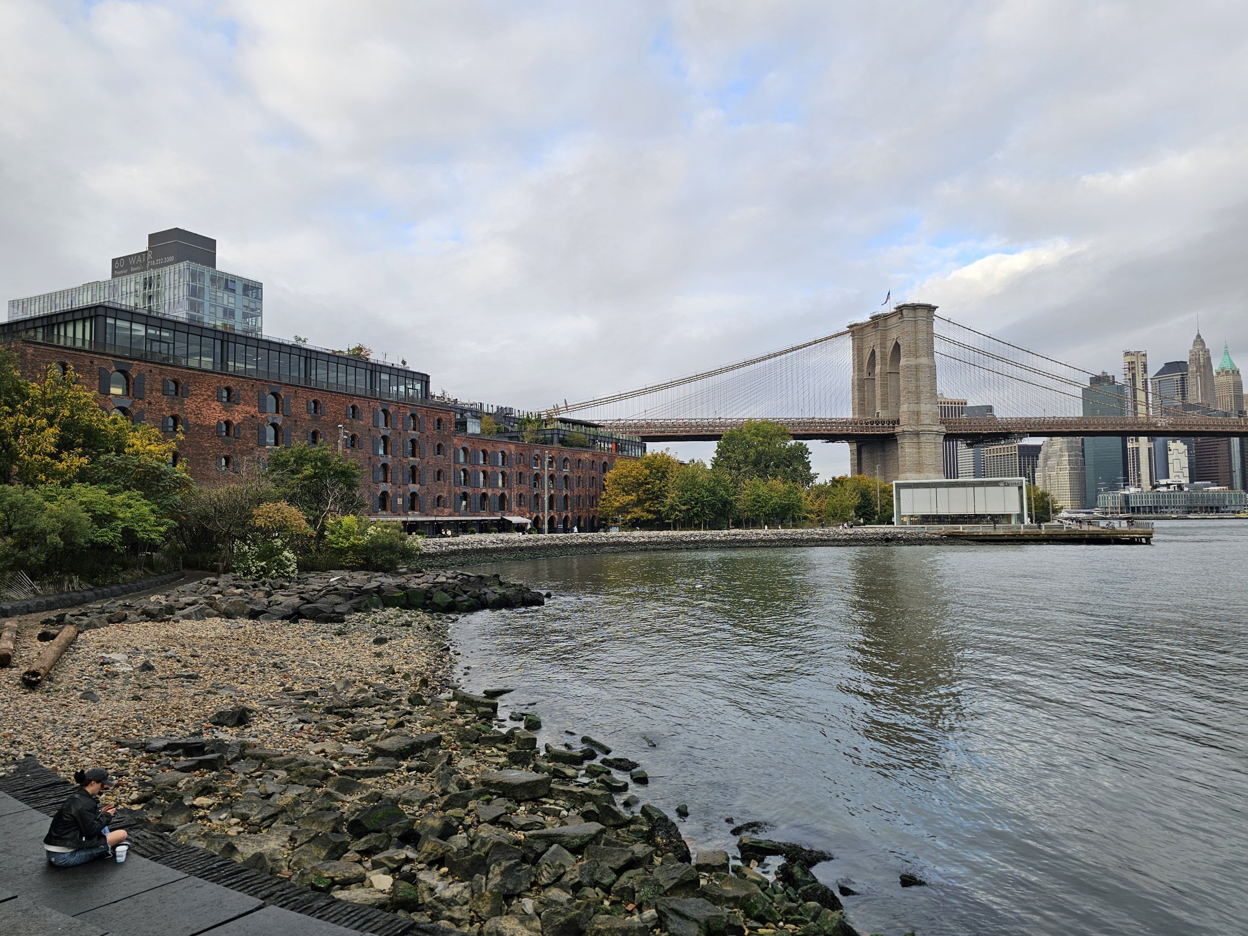 De pe malul râului, puteți vedea atât podurile Manhattan și Brooklyn, cât și orizontul Manhattanului în fundal.