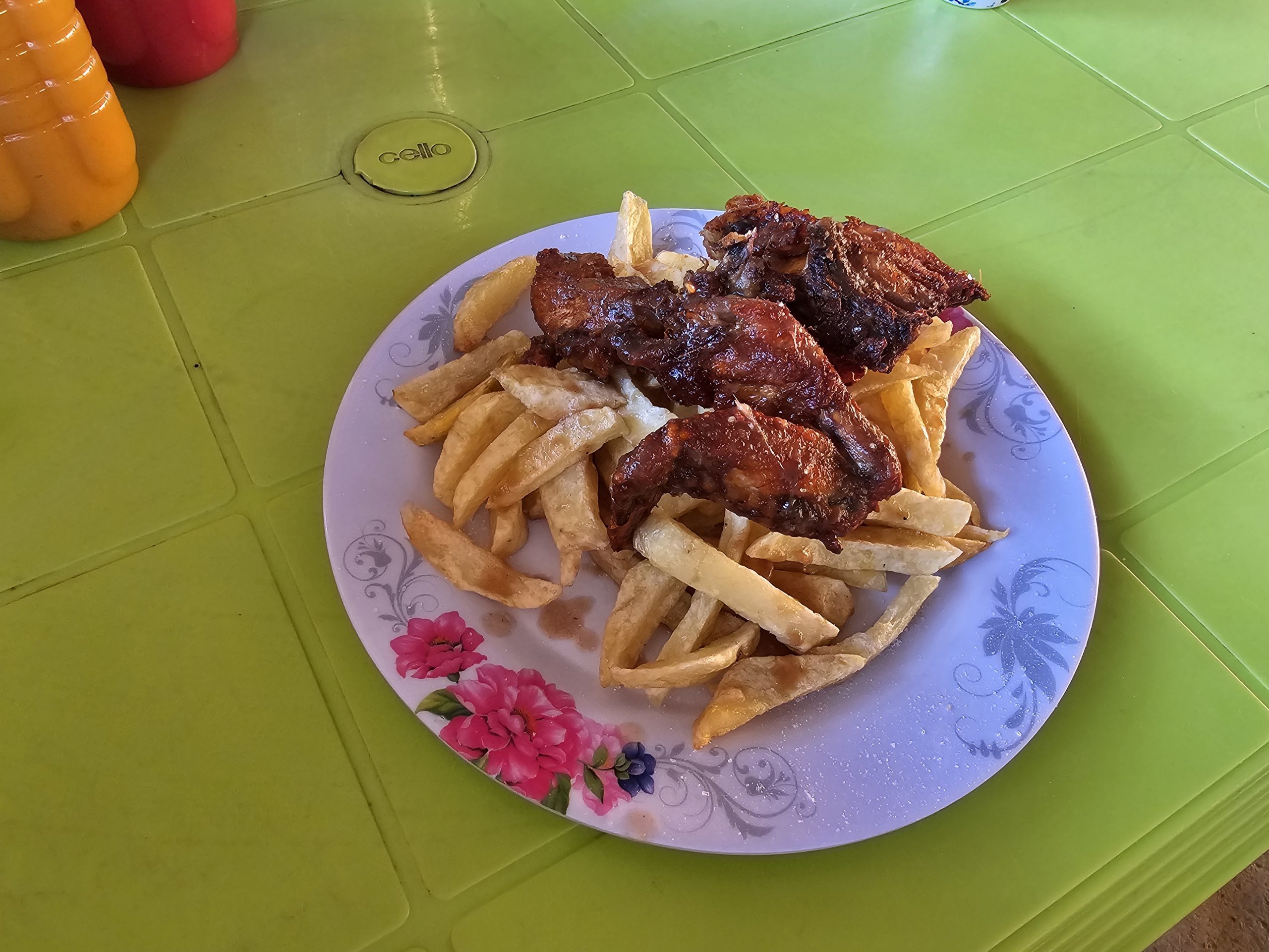 - în meniu cu chipsuri / cartofi, salată, eventual banană prăjită în jur de 6 000 tzs până la 8 500 tzs