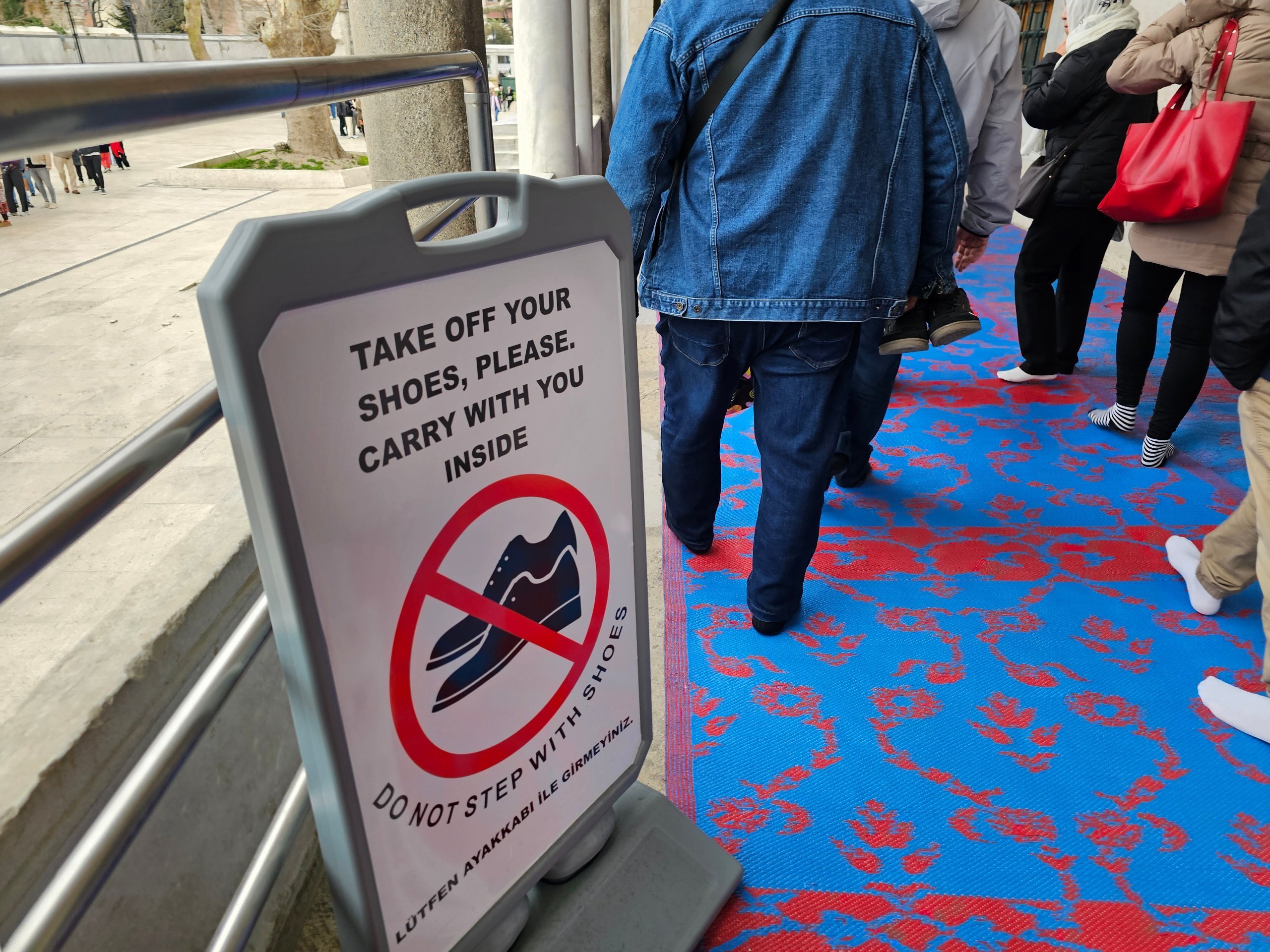 - vă descălțați înainte de a intra și îi purtați în mână tot timpul (ieșirea este pe partea cealaltă față de intrare)