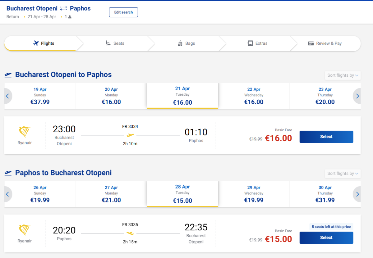 Biletele dus-întors de la București la Paphos cu Ryanair sunt disponibile în prezent de la 31 eur. Cele mai bune date sunt în principal în aprilie și mai, de exemplu: