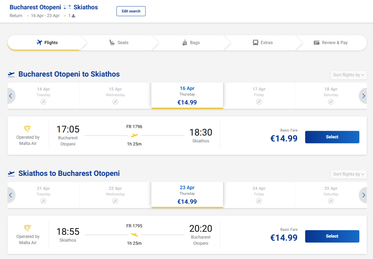 Ryanair vinde deja bilete pentru serviciul său sezonier din București către insula grecească Skiathos, care începe la începutul lunii aprilie. Cele mai mici tarife dus-întors sunt disponibile în prezent, în special pentru datele din aprilie.