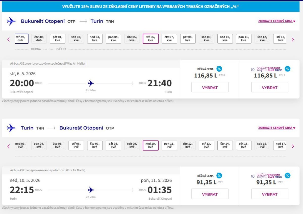 Compania aeriană low-cost Wizz Air oferă bilete la preț redus de la București la Torino, Italia.