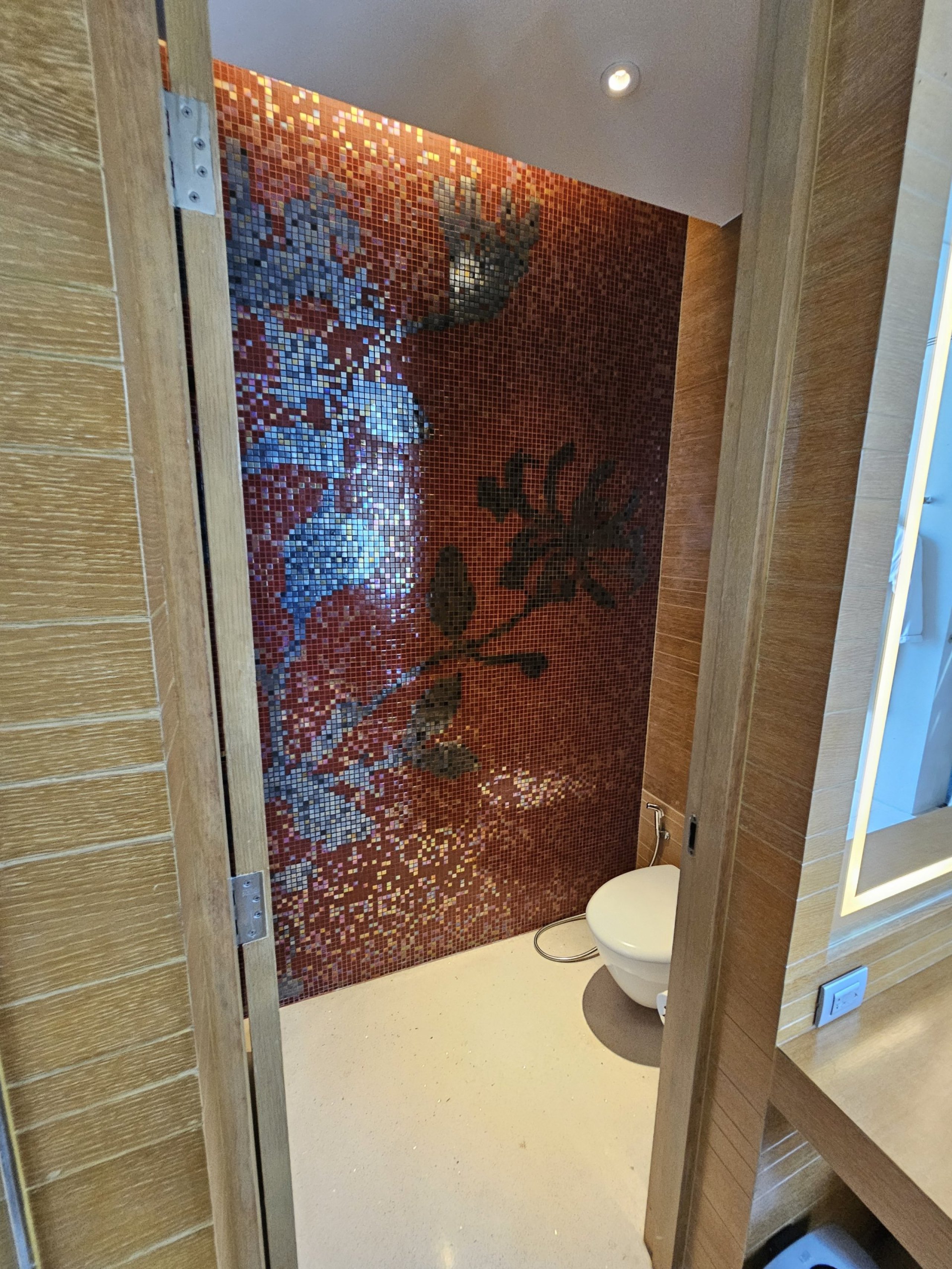 Baia este aproape la fel de mare ca dormitorul - există două dușuri, unul clasic și unul în aer liber, precum și o toaletă separată, două chiuvete și o baie frumoasă cu vedere.