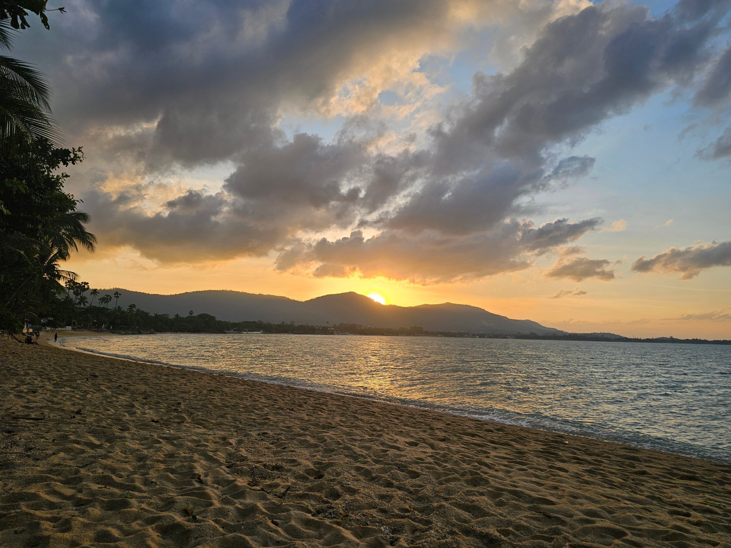 De pe plajă, puteți privi apusuri de soare spectaculoase peste munții din Koh Samui.