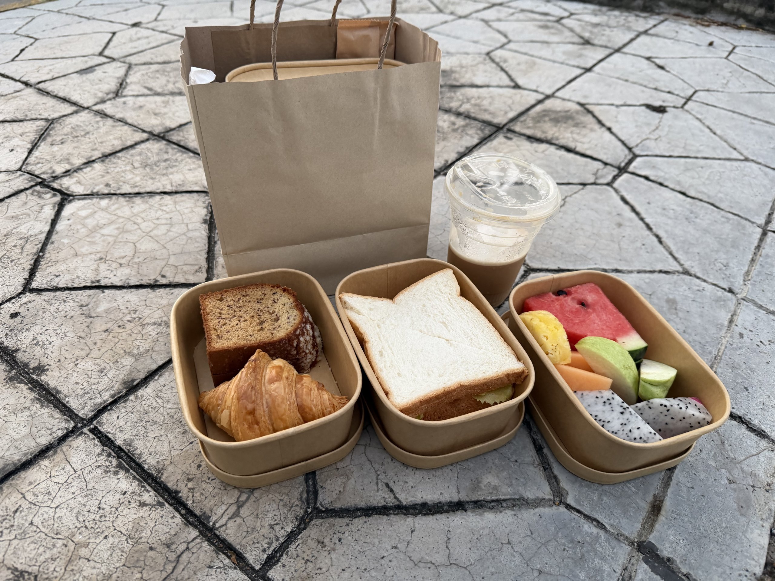 Recepția ne-a oferit opțiunea unei cutii de mic dejun takeaway pe cont propriu. Pachetul a inclus cafea, două bucăți de pâine prăjită și fructe. Destul de basic, dar amplu suficient pentru o dimineață devreme și un gest foarte frumos.