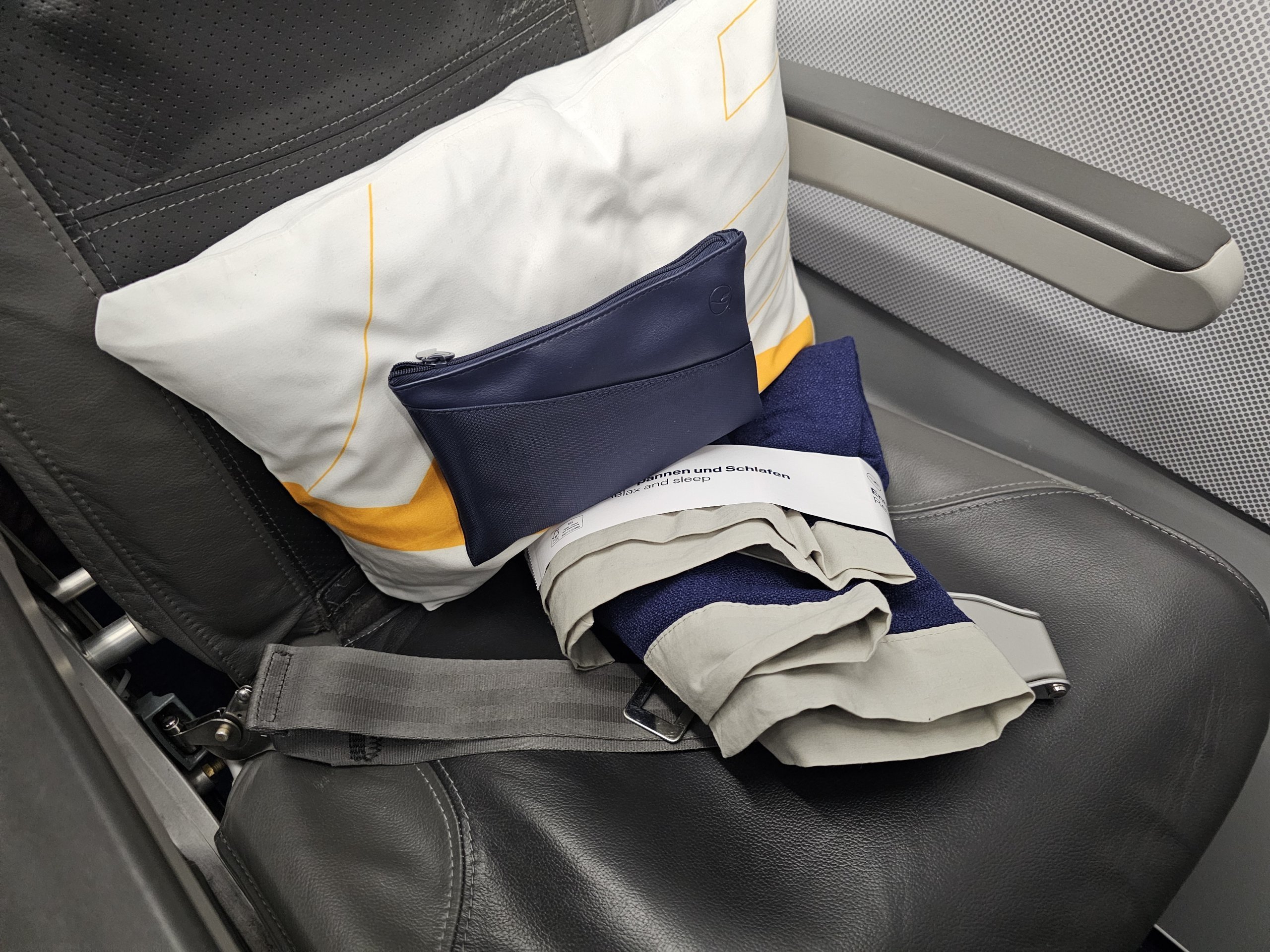 Cu toate acestea, conținutul amenity-kit-ului este un pic mai sărac la Lufthansa, iar perna este și ea mai mică. În interiorul genții găsesc aceste lucruri: