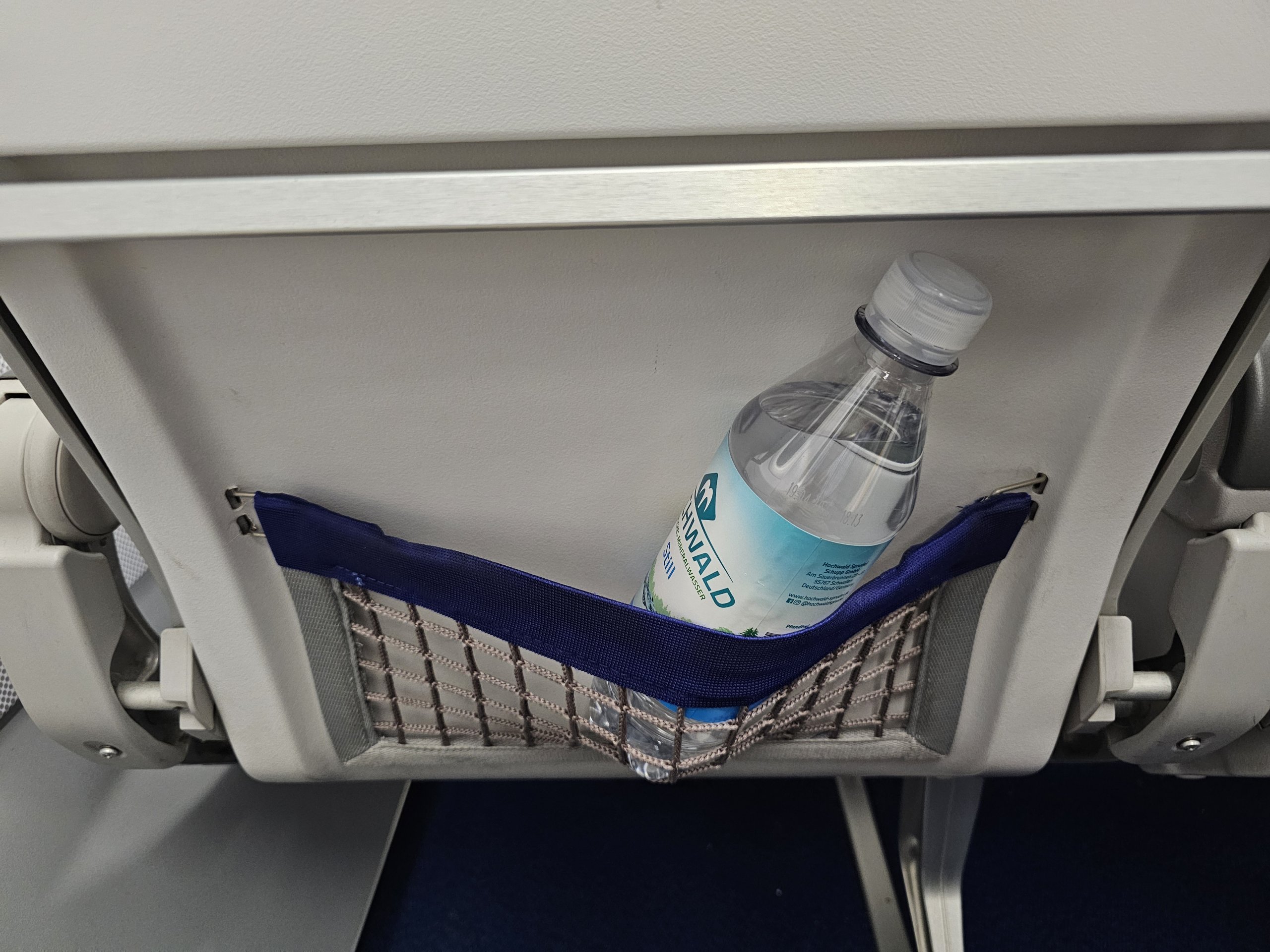 Nu există nicio băutură de bun venit înainte de plecare. Acesta este înlocuit doar de o sticlă de apă de 0,5 l într-o plasă lângă scaun.