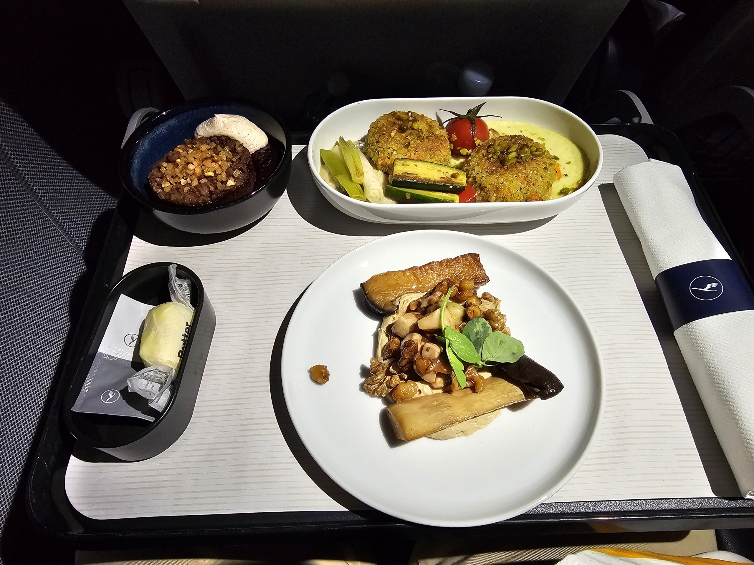 Am mâncat mese mai bune în avion, quinoa este uscată și cu pesmet, deci masa nu este atât de ușoară pe cât mă așteptam. Dar aperitivul cu ciuperci este grozav, iar crumble-ul de prune este și el delicios,