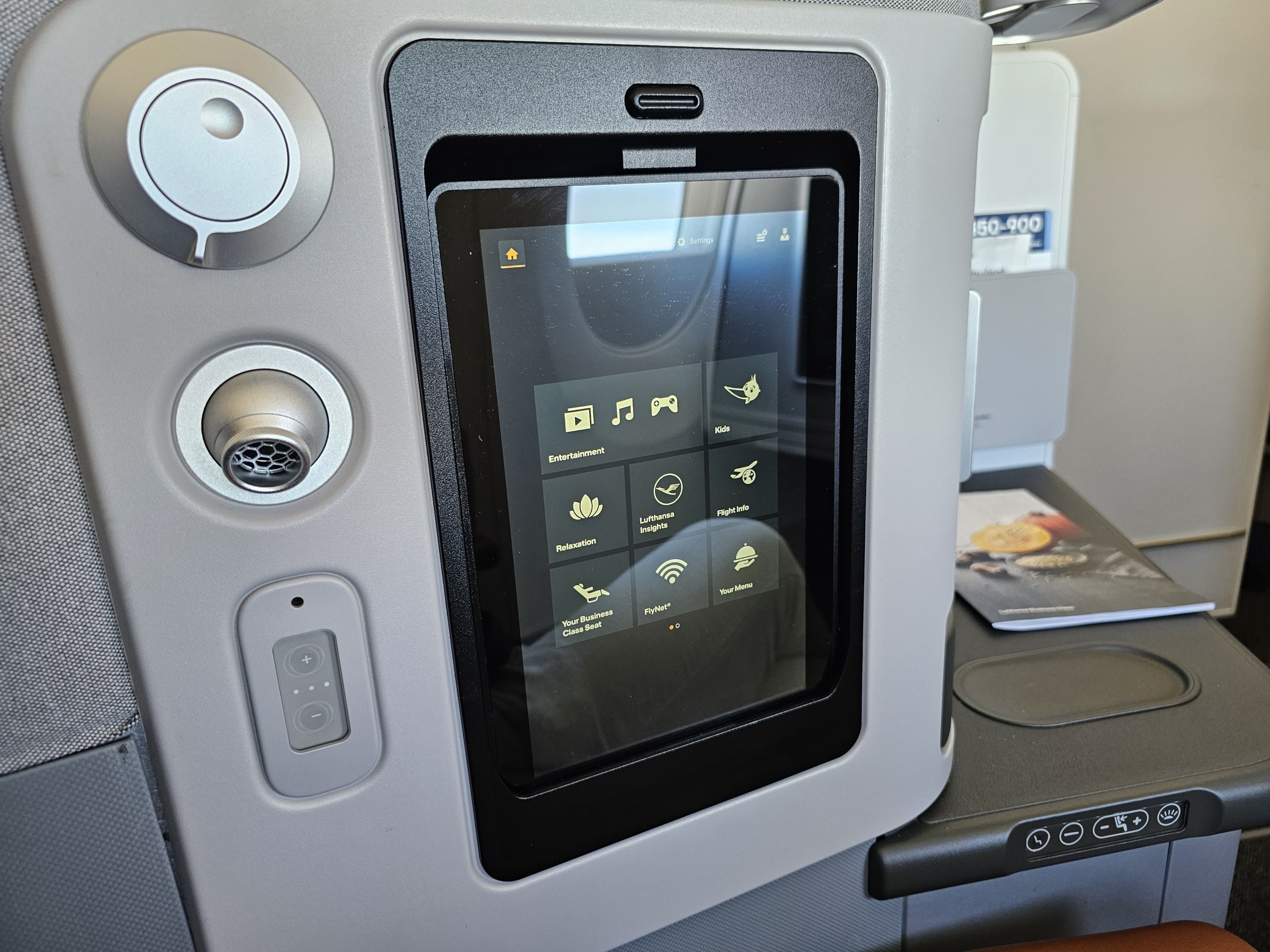 Monitorul cu rezoluție 4K este grozav. Comenzile sunt fie touchscreen direct pe monitor, fie prin intermediul unei tablete la scaun, astfel încât să puteți controla IFE cu scaunul înclinat sau din pat.