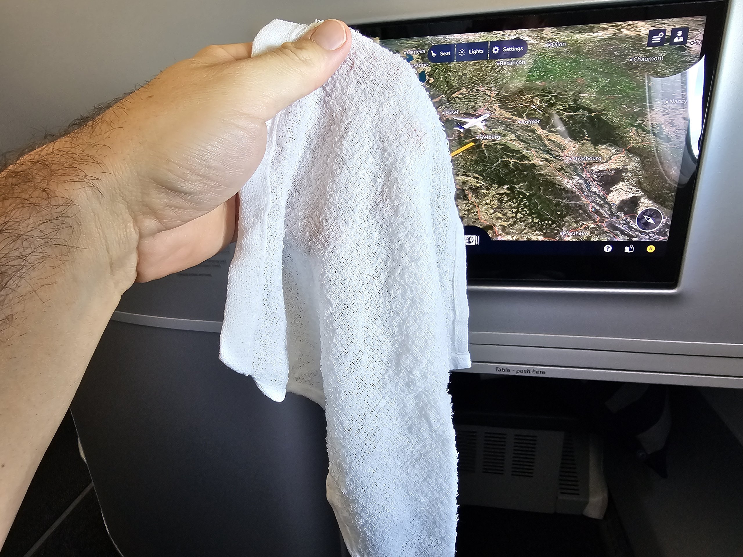 Felul principal sosește la aproximativ o oră după decolare. Înainte de masă, primim tradiționalul șervețel umed fierbinte, care este împărțit încă o dată înainte de aterizare.