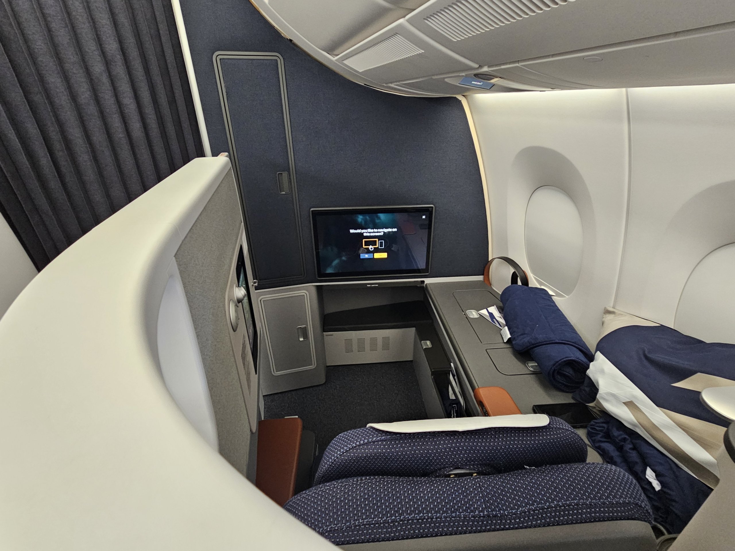 Zburăm cu un Airbus A350-900 vechi de doar câteva luni, iar cabina clasei business pare nouă și modernă la prima vedere.