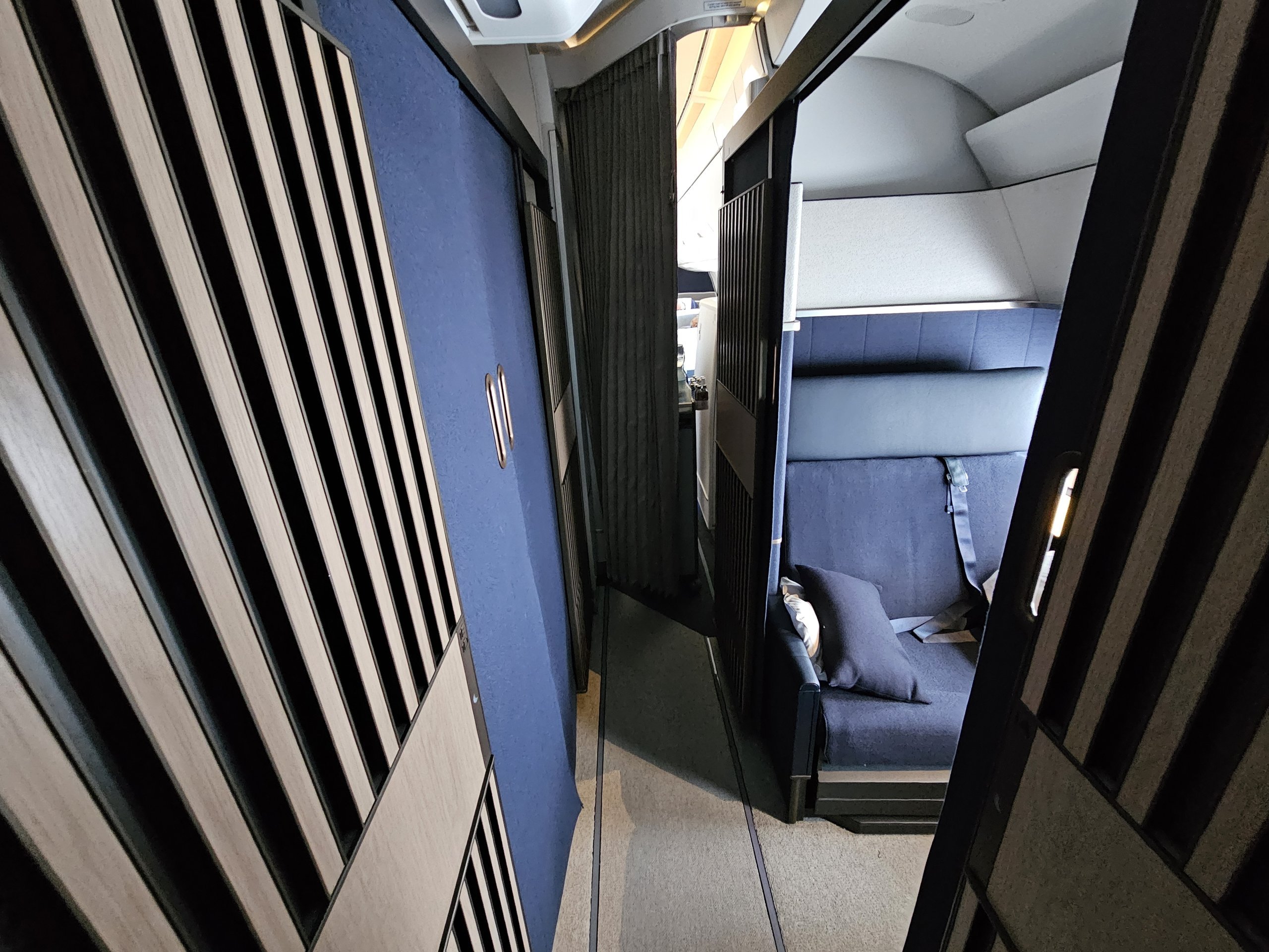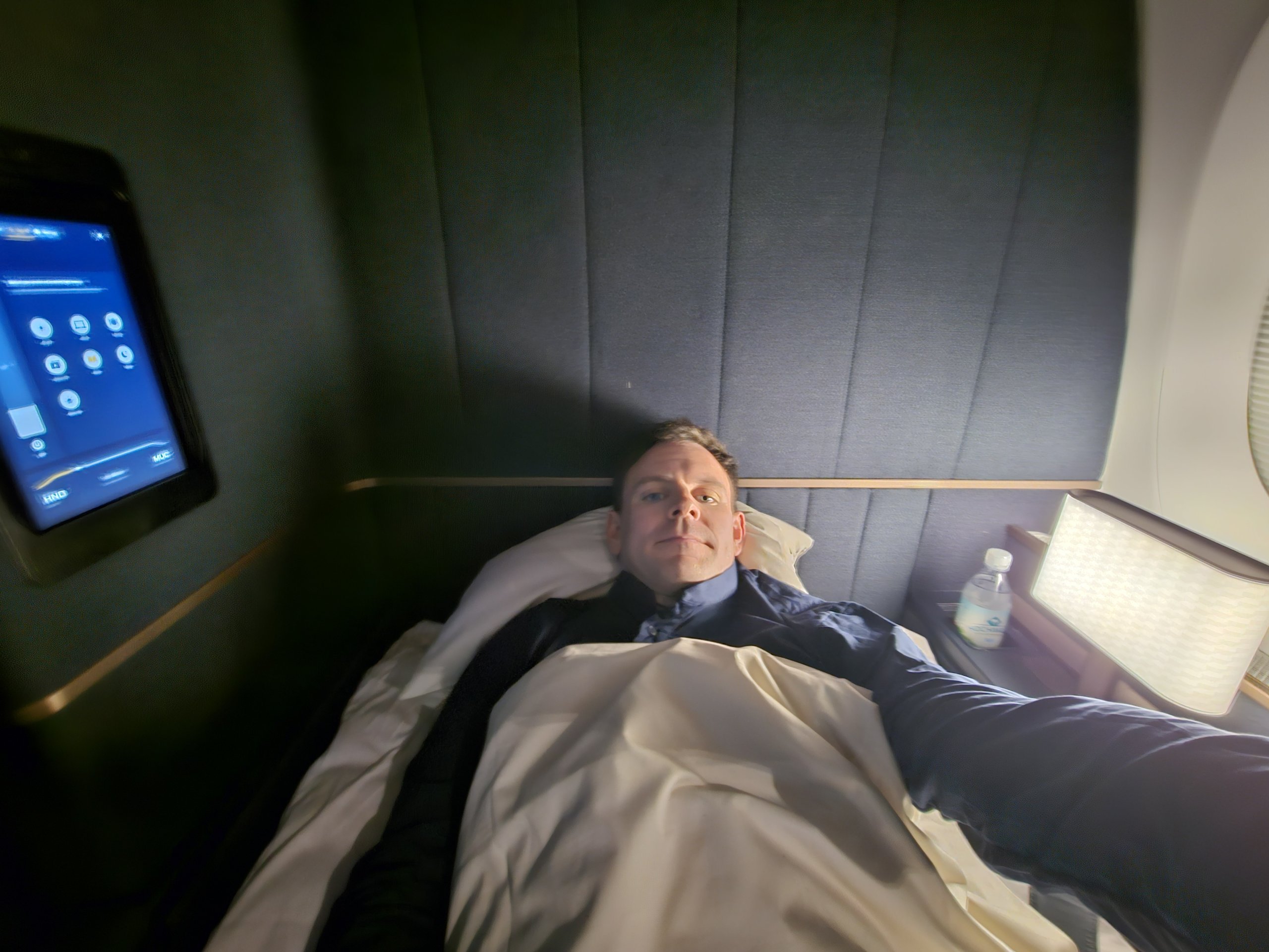 Așa că, la scurt timp după prânz, mă duc la toaletă să mă schimb în pijama. Între timp, un steward serviabil îmi pregătește patul (scaunul se poate desfășura singur prin apăsarea unui buton, dar așternuturile și pătura sunt plasate în compartimente la care doar echipajul are acces).