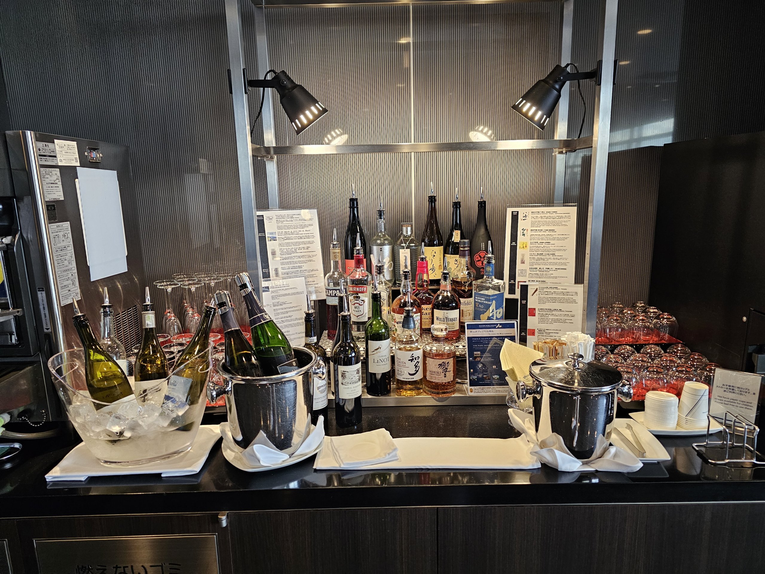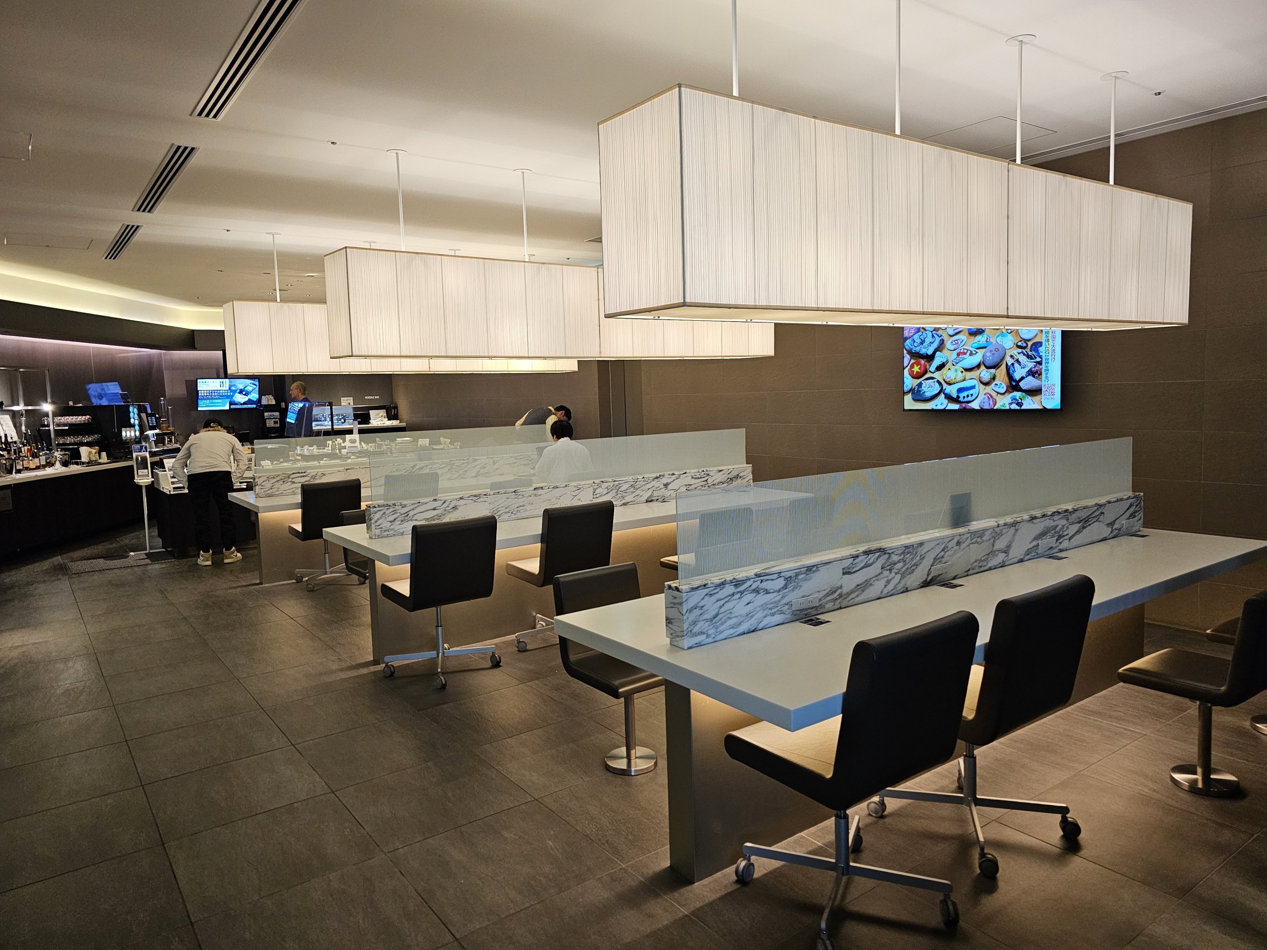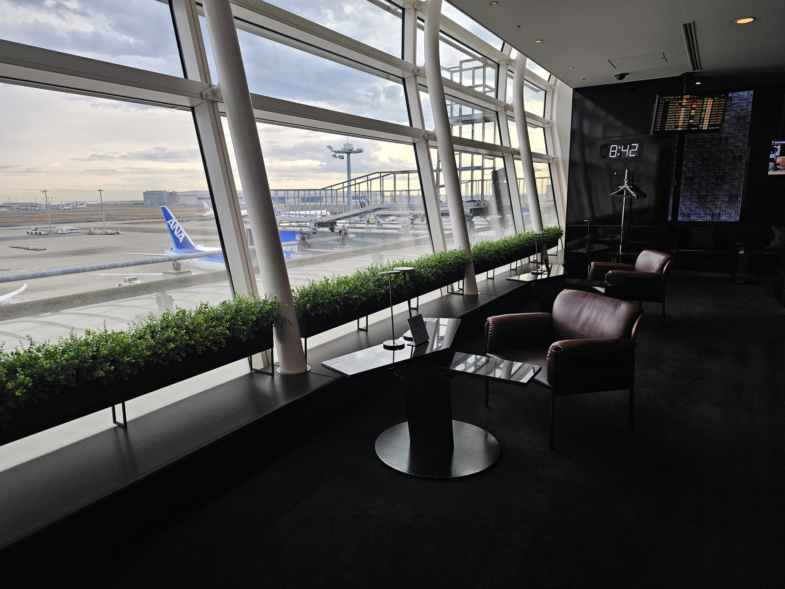 Salonul este foarte spațios, cu o priveliște minunată asupra asfaltului și o mulțime de cabine care imită scaunele de primă clasă de pe ANA Japan Airlines.