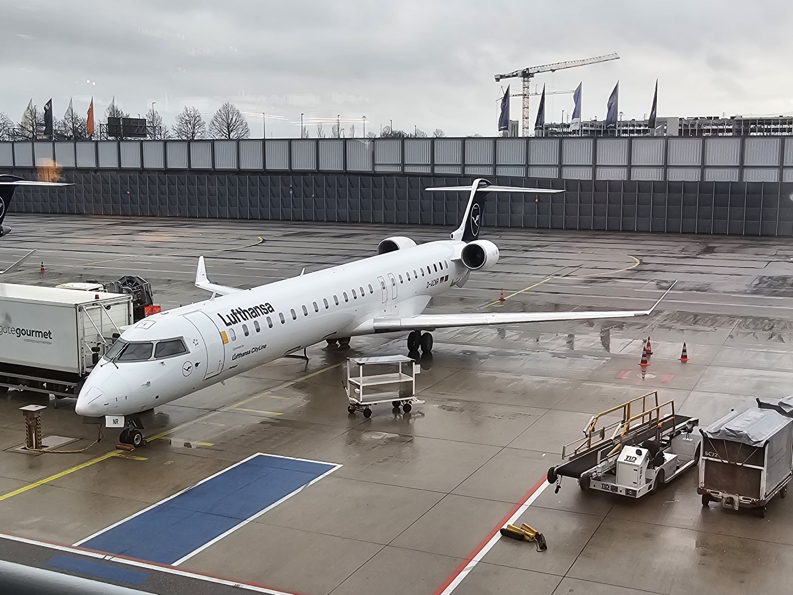Mă îndrept spre avion cu aproximativ 15 minute înainte de îmbarcare. Zburăm cu cel mai mic avion din flota Lufthansa - un Bombardier CRJ-900 - ceea ce înseamnă că îmbarcarea nu se face pe puntea de îmbarcare, ci pe jos.