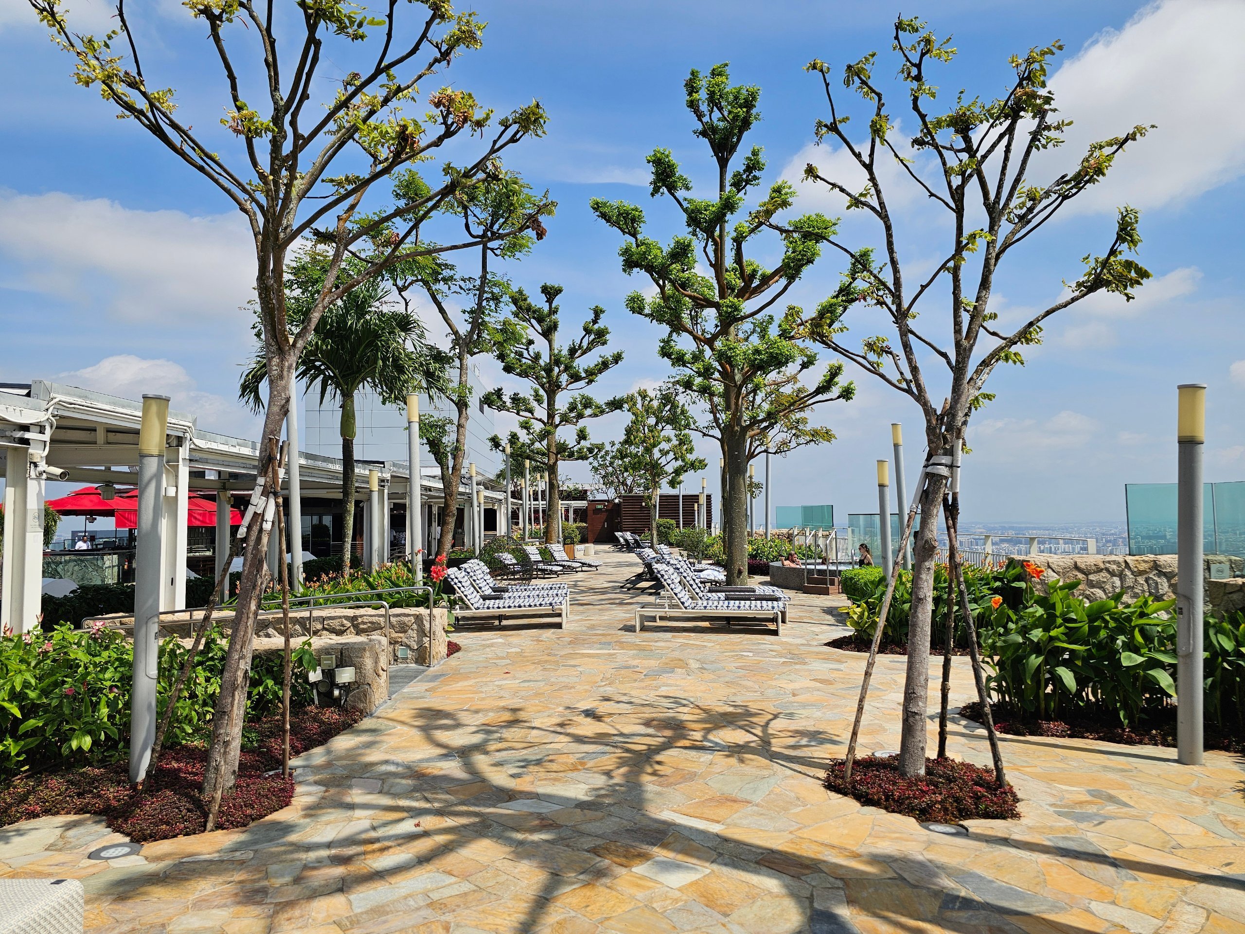 Șezlongurile sunt situate și pe cealaltă parte a acoperișului, unde nu există piscină și este mai liniște.