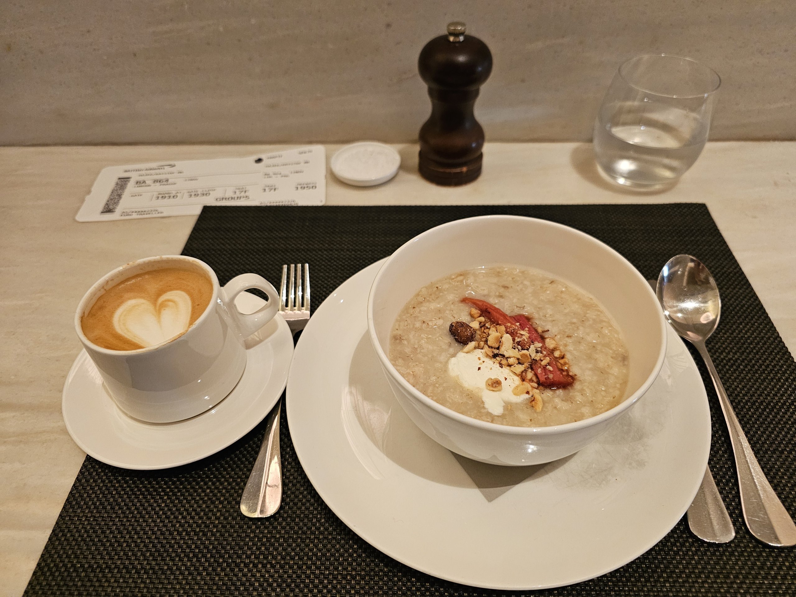 Prânzul a fost supă, urmată de cartofi, legume la grătar, inele de ceapă și curry indian. În această privință, meniul este probabil cel mai prost dintre toate saloanele oneworld din Terminalul 3.