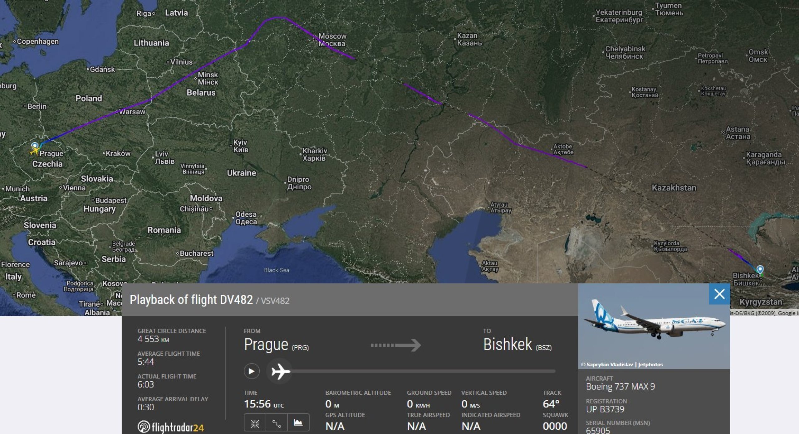 Din cauza faptului că zburăm pe un Boeing 737 cu corp îngust, nu este realist să parcurgem această distanță cu o singură realimentare. Prin urmare, se face o escală tehnică în Kârgâzstan pentru realimentare. Oprirea durează mai puțin de o oră, iar pasagerii rămân la bordul aeronavei tot timpul.